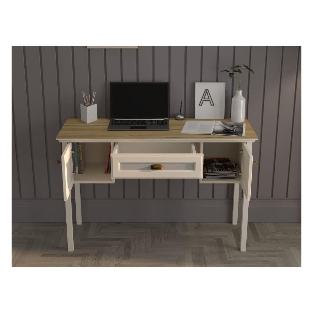 Muuda oma õpingute ruum stiilseks ja funktsionaalseks pelgupaigaks meie õpingute lauaga. Valmistatud 100% melamiinkattega puitlaastplaadist ja MDF-ustest, on see laud mitte ainult vastupidav, vaid kiirgab ka elegantsi. 18 mm paksus ja 0,8 mm servakaitse tagavad tugeva konstruktsiooni, mis kestab aastaid.Elegantne disain produktiivseks keskkonnaksSelle õpingute laua voolujooneline disain tõstab teie tööruumi välimust, muutes selle kohaks, kus saate keskenduda ja olla produktiivne. Kreemjad, tamme- ja hallid värvid lisavad igasse ruumi natuke rafineeritust, samas kui metallist käepidemed ja MDF-profiiljalad annavad modernse puudutuse.Lihtne organiseeridaPaljude riiulite ja võimalusega see seina kinnitada, pakub see laud piisavalt hoiuruumi kõigi teie õpingute tarvikute jaoks. Hoidke oma raamatud, kirjutusvahendid ja muud esemed käeulatuses, et saaksite olla organiseeritud ja keskenduda oma ülesannetele.Tehnilised andmed:Materjal: 100% melamiinkattega puitlaastplaat, 100% MDF-uksedPaksus: 18 mmServakaitse: 0,8 mmMõõtmed: Laius 132 cm, Kõrgus 80 cm, Sügavus 50 cmJala kõrgus: 15 cmJalad: MDF-profiiljaladOmadused: Metallist käepidemed, arvukad riiulid, saab kinnitada seinaVärv: Kreem, Tamm, Hall Värv: Cream Oak Grey