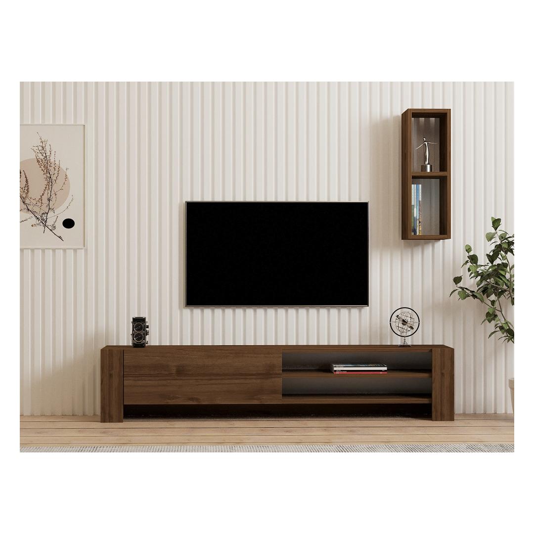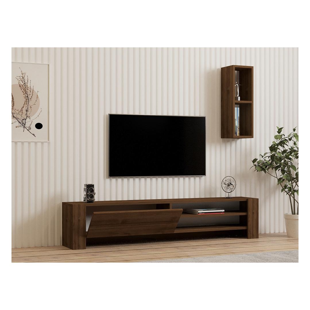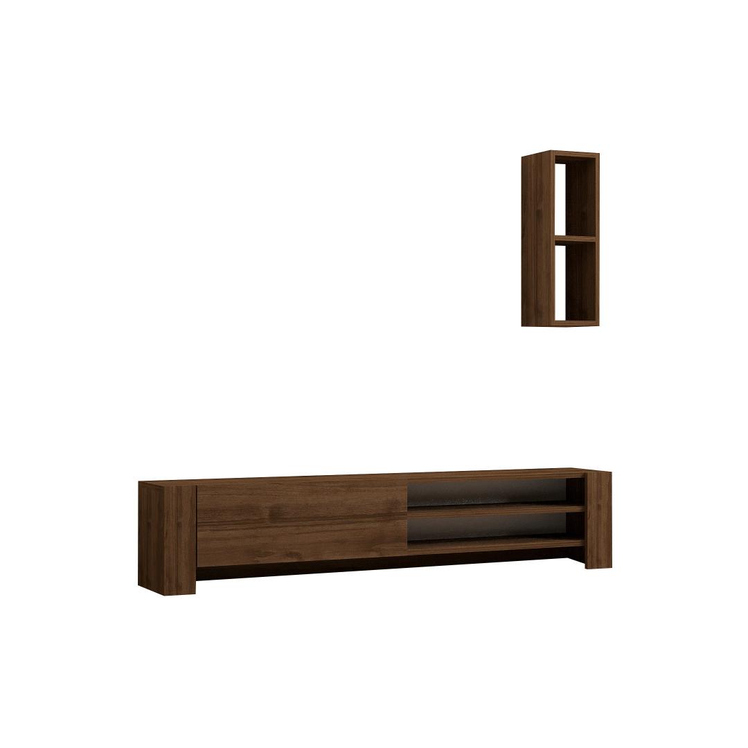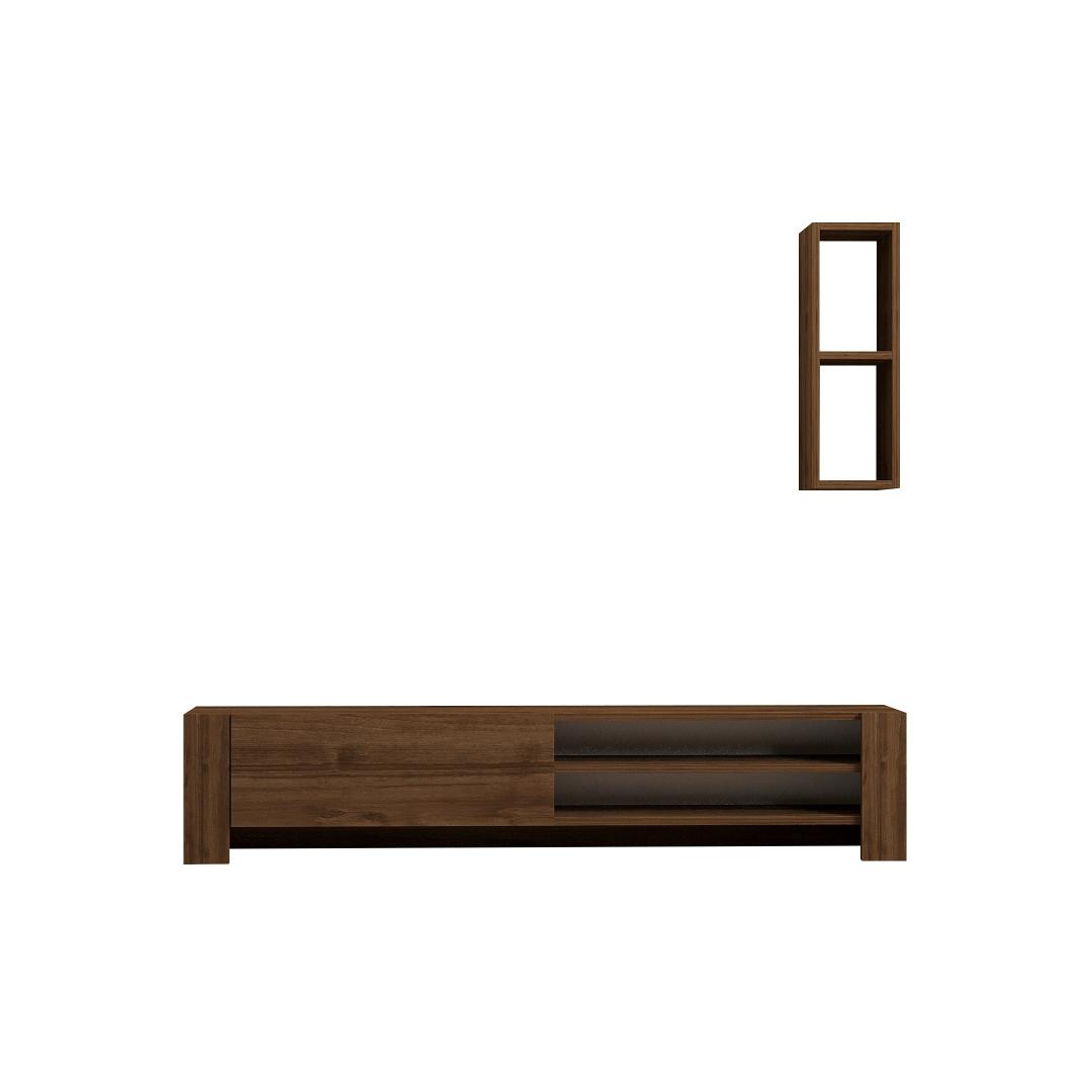 Muuda oma elutuba stiilseks ja organiseeritud ruumiks meie uimastava televiisoripulga abil. See 100% melamiiniga kaetud puitlaastplaadist valmistatud teleritugi ei ole mitte ainult vastupidav, vaid ka elegantse pähklipuidust viimistlusega. Elegantne disain kaasaegsetesse eluruumidesseSee elegantse ja moodsa disainiga teleripult tõstab koheselt teie elutoa väljanägemist. 18 mm paksune puitlaastplaat tagab vastupidavuse ja pikaealisuse, muutes selle praktiliseks ja stiilseks täienduseks teie kodule. Rikkalik hoiuruum teie meelelahutusvajaduste jaoksTänu arvukatele riiulitele ja täiendavale seinariiulile pakub see teleripult rohkelt hoiuruumi kõigile teie meelelahutusvahenditele. Alates dvd-dest kuni mängukonsoolideni saate hoida kõike organiseeritult ja käeulatuses. Kergesti paigaldatav ja mitmekülgneSeda teleri statiivi saab hõlpsasti seinale kinnitada, et suurendada stabiilsust ja turvalisust. Selle mitmekülgne disain võimaldab teil kohandada paigutust vastavalt oma eelistustele, mistõttu sobib see igasse elutoa paigutusse. Tehnilised üksikasjad:Materjal: materjal: 100% melamiiniga kaetud puitlaastplaatPaksus: 18 mmTelerikapi suurus: Laius: 160 cm, kõrgus: 33 cm, sügavus: 26. 8 cm.Seina riiuli suurus: Laius: 19. 9 cm, kõrgus: 60 cm, sügavus: 19. 6 cm.Värv: Pähkli värvi(d) Värv: Walnut