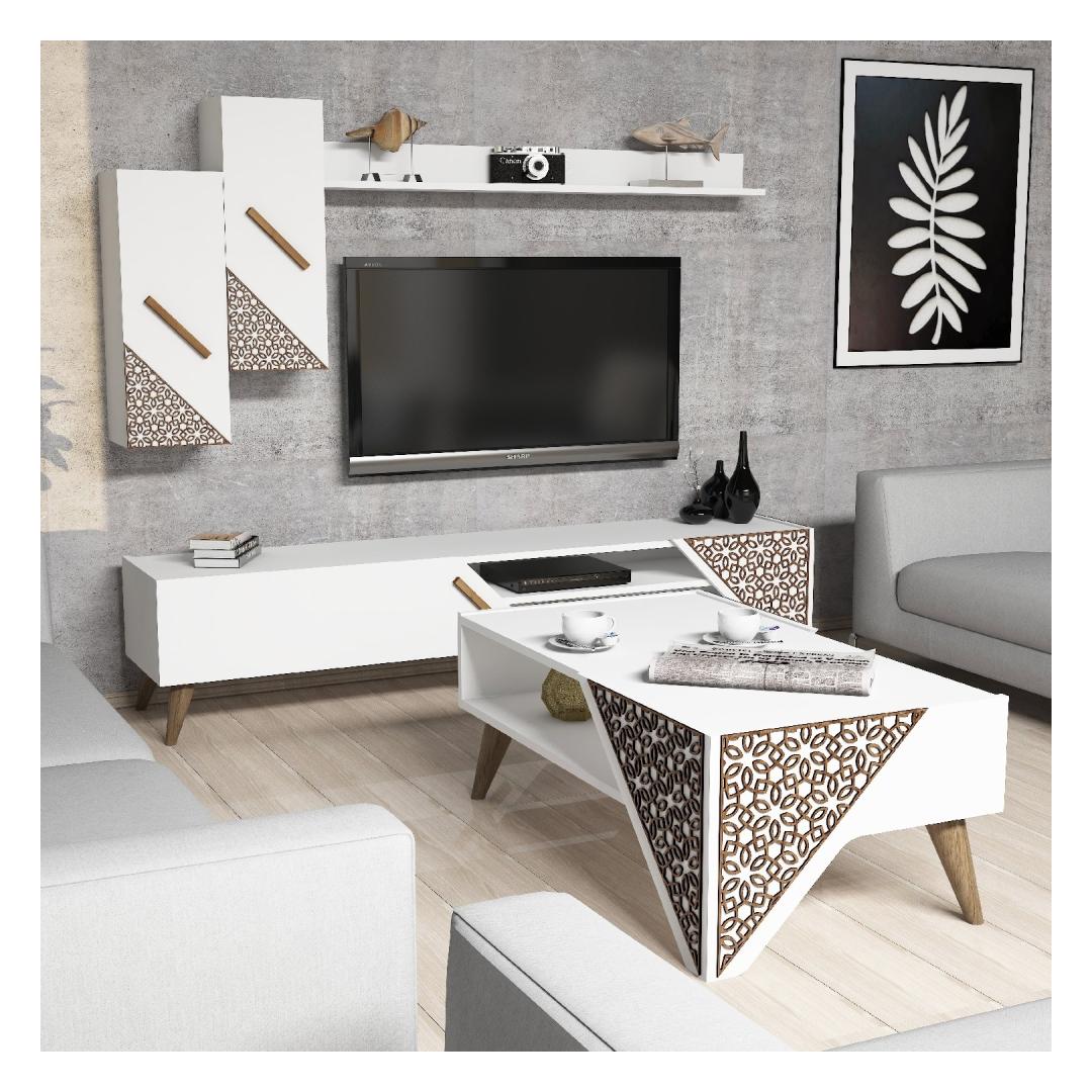 The TV unit, coffee table, wall shelf, and cabinet are designed to elevate your space with their sleek and contemporary design. The 2-tier coffee table offers ample storage space, while the wall shelf and cabinet provide additional storage options. The white color scheme adds a touch of freshness and brightness to your room, creating a welcoming atmosphere for you and your guests.