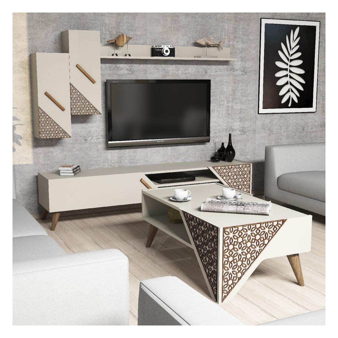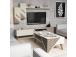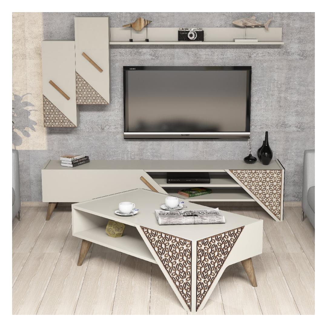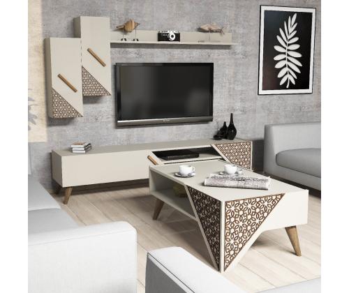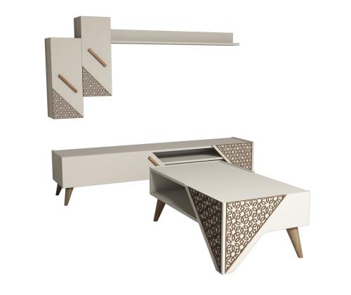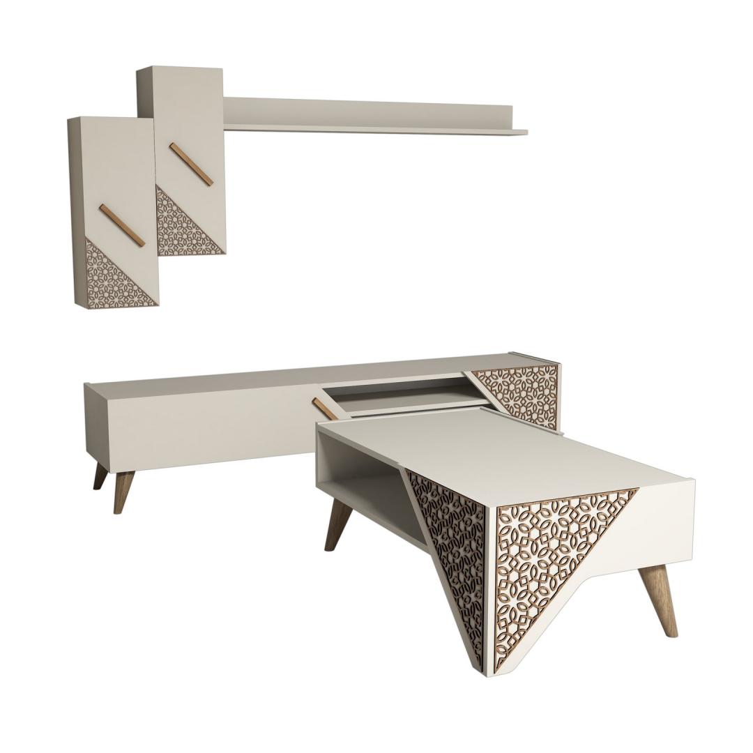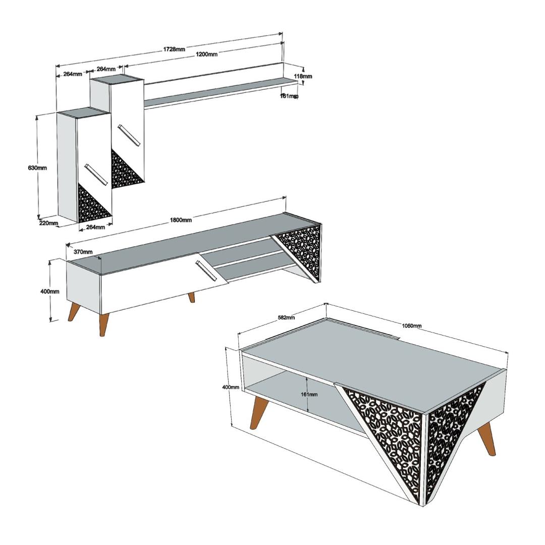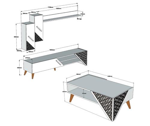 This set includes a TV unit, a 2-tier coffee table, a shelf, and a wall shelf, offering ample storage space for all your essentials. The numerous shelves allow you to neatly organize your belongings, while the option to fix the set to the wall adds an extra layer of safety and stability.