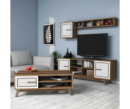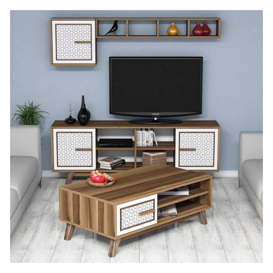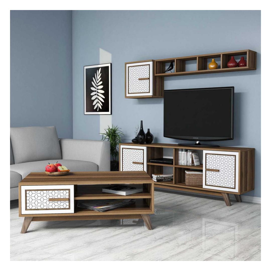 This set is not only visually appealing but also highly functional. The TV unit can accommodate a television of up to 160 cm in width, while the wall shelf adds a touch of sophistication to your decor. The coffee table is the perfect spot to showcase your favorite books or display decorative items.