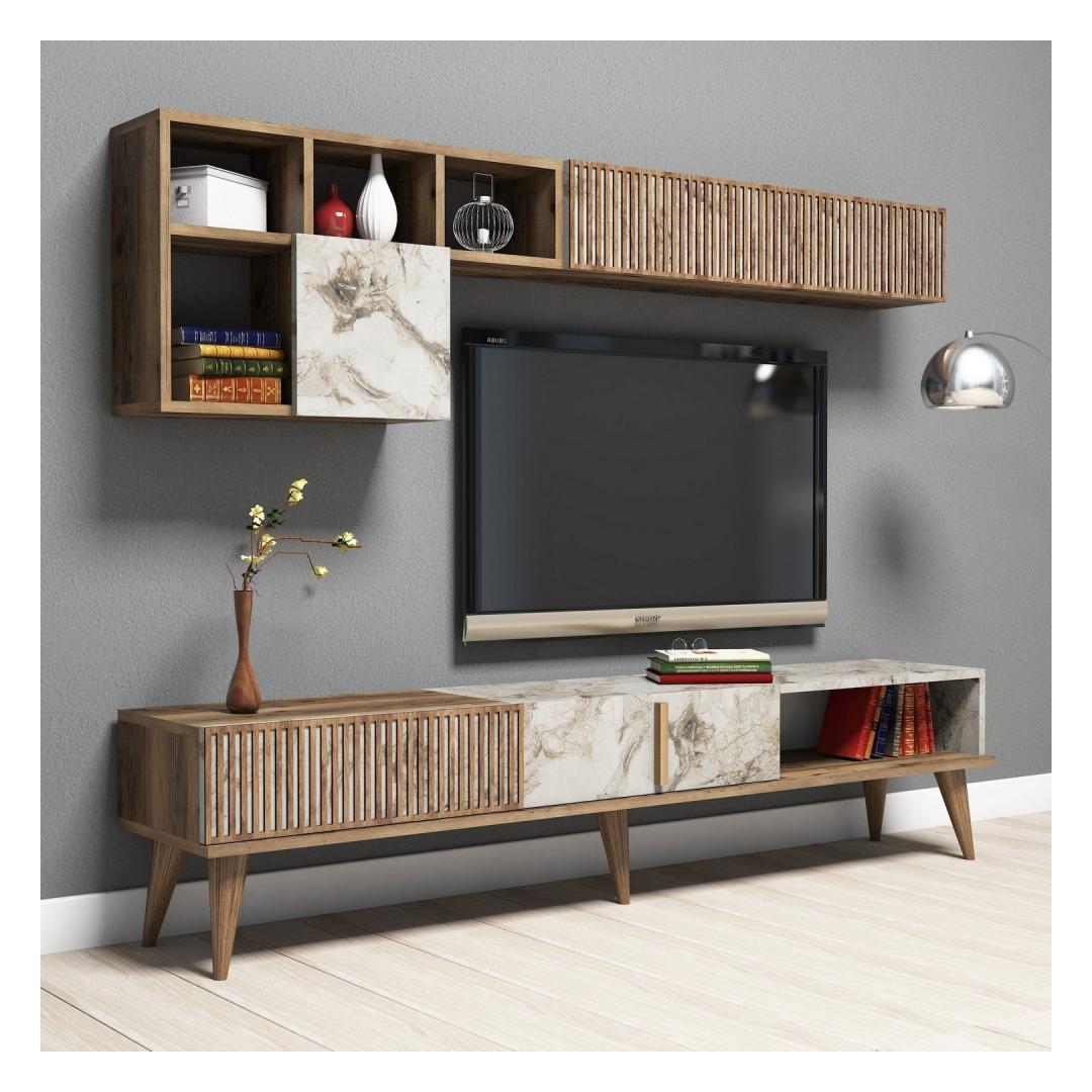 The TV stand, wall shelf, and coffee table in this set are designed to perfection, with sleek lines and a modern aesthetic that will instantly elevate the ambiance of your living room. The walnut and white color combination adds a touch of sophistication to any decor, making it a versatile choice for any home.
