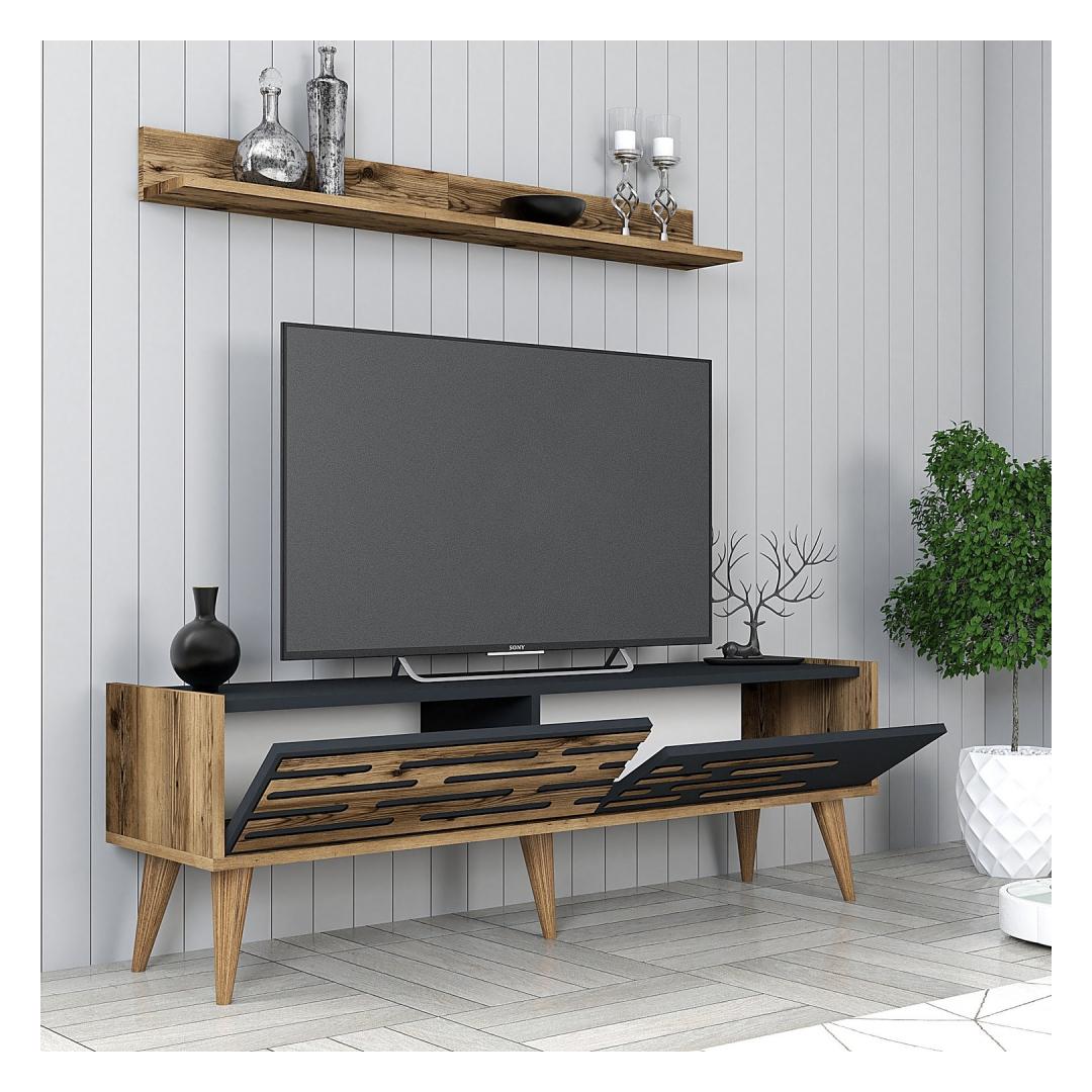 Välistage oma eluruumi stiilse ja funktsionaalse televiisorigaMuutke oma elutuba stiilseks ja elegantseks paradiisiks meie suurepärase telerikomplektiga. See ülima täpsusega ja detailidele tähelepanu pöörates valmistatud ese on loodud selleks, et tõsta teie kodu sisustus uutesse kõrgustesse. Võrratu vastupidavus ja kvaliteetValmistatud 100% melamiiniga kaetud puitlaastplaadist, on meie telerikapp valmistatud kestma. 18 mm paksus tagab vastupidavuse ja stabiilsuse, mis võimaldab teil nautida oma meelelahutuskeskust aastaid. Rikkalik hoiuruumArvukate riiulite ja täiendavate hoiuvõimalustega pakub meie tv-üksus piisavalt ruumi oma meediaseadmete, dvd-de ja muude oluliste esemete korraldamiseks. Ütle hüvasti segadusele ja tere puhtale ja organiseeritud elutoale. Sleek ja moodne disainPähklipuu- ja antratsiitvärvide kombinatsiooniga lisab meie tv-plokk elegantsi igasse ruumi. Plastikust käepide ja jalad parandavad üldist esteetikat, luues elegantse ja moodsa välimuse, mis avaldab külalistele muljet. Tehnilised üksikasjad:Materjal: Materjal: Materjal: Materjal: Materjal: Materjal: Materjal: Materjal: materjal: 100% melamiiniga kaetud puitlaastplaatPaksus: 18mmTeleri statiivi suurus: Laius: 140 cm, kõrgus: 35 cm, sügavus: 45 cm.Seina riiuli suurus: Laius: 120 cm, kõrgus: 16 cm, sügavus: 11. 8 cm.Plastikust käepide lihtsaks avamiseks ja sulgemiseksPlastist jalad stabiilsuse ja vastupidavuse tagamiseksArvukad riiulid mugavaks hoiustamiseksVärv: pähkelpuu ja antratsiit Värv: Walnut Anthracite