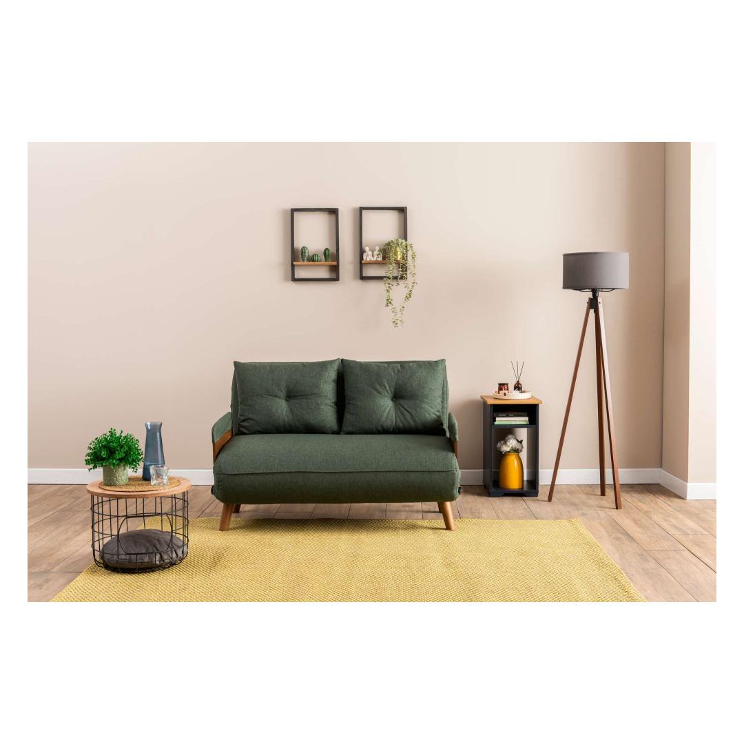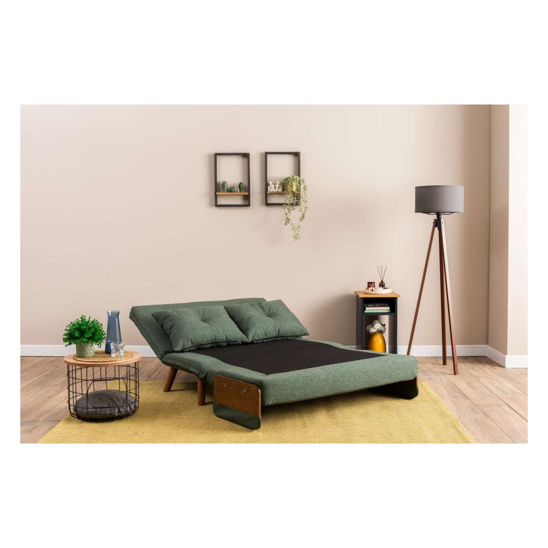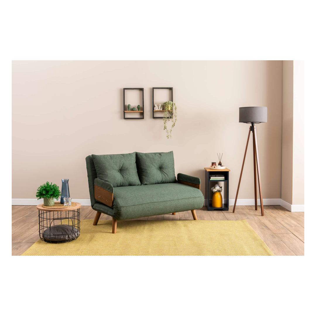 Measuring at 78 cm x 120 cm x 82 cm as a sofa and 190 x 120 cm as a bed, this 2-seat sofa-bed is the perfect space-saving solution for any home. The sleek green color adds a pop of personality to your decor, while the wooden armrests provide a touch of elegance to the modern design.