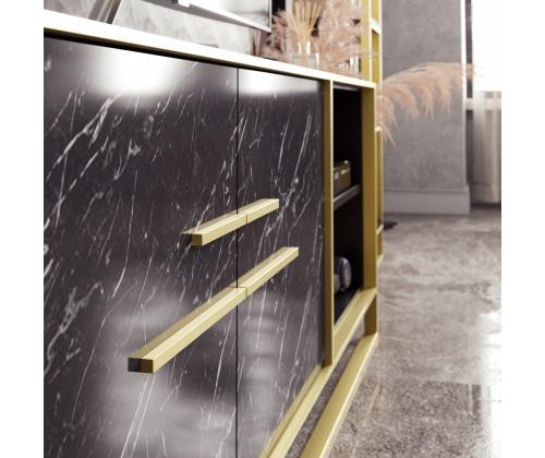 Tutvustame meie suurepärast telerialust, mis on meistriteos, mis muudab teie eluruumi elegantsi ja luksuse paradiisiks. See telerialus on oma uimastava barokist inspireeritud disaini ja glamuurse marmormustriga rafineeriva disainiga keerukuse kehastus. Vabastage elegantsi jõudSukelduge meie teleripuldi külluslikkusse, mis on hoolikalt valmistatud, et tõsta teie kodu sisekujundus uutesse kõrgustesse. Selle kuldsed aktsendid ja elegantne must viimistlus õhkavad suursugusust, mis teeb sellest täiusliku keskse osa teie meelelahutusruumi jaoks.Lõputud võimalusedSee televiisoripult pakub rohkelt riiuleid, mis pakuvad piisavalt ruumi kõigi teie meediaseadmete, dvd-de ja muu jaoks. Korraldage oma meelelahutustarbeid hõlpsasti, hoides oma elutoa segadusteta ja stiilsena. Võrratu vastupidavusValmistatud 100% melamiiniga kaetud puitlaastplaadist, on see telerialus ehitatud kestma. Selle 18 mm paksus tagab erakordse tugevuse ja stabiilsuse, samal ajal kui 100% kuldsed metallosad lisavad elegantsust ja vastupidavust. Muudatlik disainMeie teleristatiivi saab hõlpsasti seinale kinnitada, mis pakub täiendavat turvalisust ja stabiilsust. Olenemata sellest, kas teil on väike korter või avar kodu, kohandub see statiiv teie vajadustele, maksimeerides teie ruumi ja luues sujuv visuaalse elamuse. Tehnilised üksikasjad:Materjal: Materjal: Materjal: Materjal: Materjal: Materjal: Materjal: Materjal: materjal: 100% melamiiniga kaetud puitlaastplaatKuldsed osad: 100% metallPaksus: 18mmTeleri stendi suurus: Laius: 160cm, kõrgus: 56. 6cm, sügavus: 38. 5cmKülgriiuli laius: 56. 4cmRiiuli kõrgus: 20. 7cmVärv: kuldne ja mustKontseptsioon: Barokk, Glam, marmorHellitage meie teleripuldi võlu ja tõstke oma kodu sisustus uutesse kõrgustesse. Kogege täiuslikku segu elegantsist, funktsionaalsusest ja vastupidavusest. Tellige kohe ja muutke oma eluruum luksuslikuks pühapaigaks. Värv: Gold Black