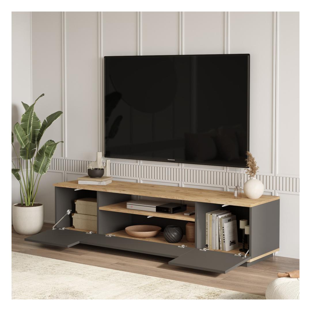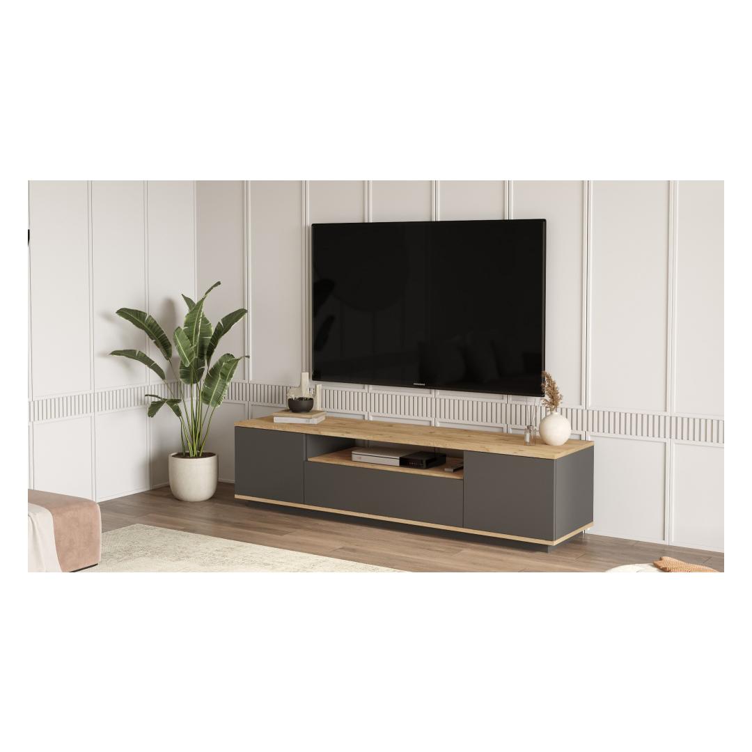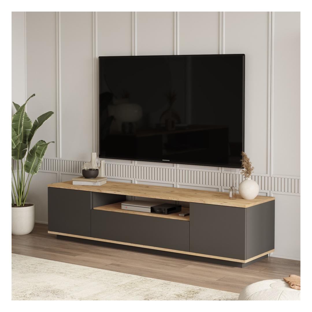 Parandage oma eluruumi kaasaegse ja stiilse teleripuldi abilMuuda oma elutuba kaasaegseks elutoaks meie moodsa ja uudse teleripuldi abil. See teleripult on loodud teie meelelahutuskogemuse tõstmiseks ja ühendab endas funktsionaalsuse ja elegantse esteetika, muutes selle ideaalseks täienduseks igasse koju. Välistage oma sisekujundust elegantsi puudutusegaSee 100% melamiiniga kaetud puitlaastplaadist valmistatud telerialus on vastupidav ja kauakestev. 18 mm paksus tagab tugevuse, mis võimaldab teil kindlalt oma televiisorit ja muid meediaseadmeid välja panna. Atlandi männi ja antratsiidi värvid lisavad teie eluruumile elegantsi, sobitudes vaevata mis tahes sisustusstiiliga. Rikkalik hoiuruum kõigi teie meelelahutusvajaduste jaoks180 cm laiuse, 44. 6 cm kõrguse ja 44. 5 cm sügavusega televiisoristendil on piisavalt ruumi teleri, mängukonsoolide, helisüsteemi ja muu jaoks. Avatud riiulid ja avarad lahtrid võimaldavad hõlpsat organiseerimist ja ligipääsetavust, hoides teie elutoa segadusteta. Lihtne kokkupanek ja muretut hooldustöödMeie televiisoripult on disainitud teie mugavust silmas pidades. Lihtsalt järgitavad juhised tagavad probleemivaba kokkupaneku, mis võimaldab teil oma uut mööblit kiiresti nautida. Lisaks muudab melamiinkate puhastamise imelihtne, pühkige lihtsalt ära igasugused lekked või tolm, et saavutada laitmatu ja lihvitud välimus. Tehnilised üksikasjad:Tootetüüp: Mööblile on lisatud ükskõik, kas see on või ei ole..: Teleri statiivMaterjal: Materjal: Materjal: Materjal: Materjal: Materjal: Materjal: Materjal: Materjal: 100% melamiiniga kaetud puitlaastplaatPaksus: 18mmLaius: 180cmKõrgus: 44. 6cmSügavus: 44. 5cmVärv: Atlandi mänd ja antratsiitKontseptsioon: Kaasaegne - uudsus Värv: Atlantic Pine Anthracite