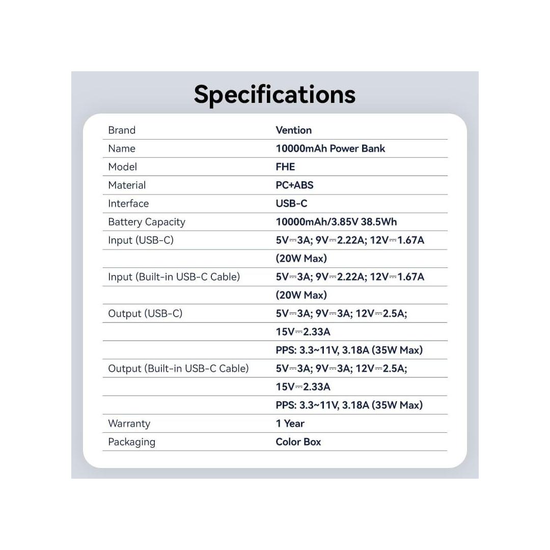 POWER BANK USB 10000MAH 35W/MINI GRAY FHEH0 VENTION