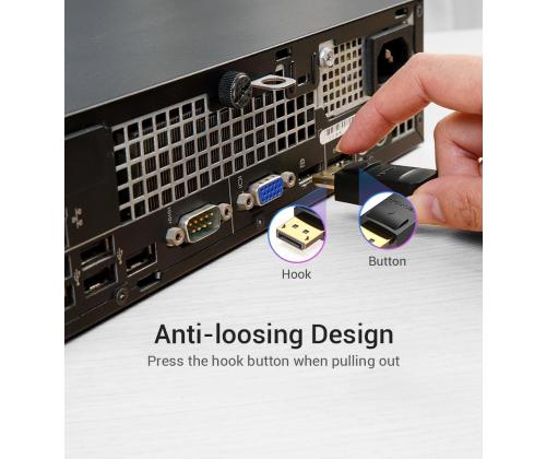 - Card hook design:The DisplayPort connector has a card hook to provide secure connection with the port. Press the button down before unplugging the connector