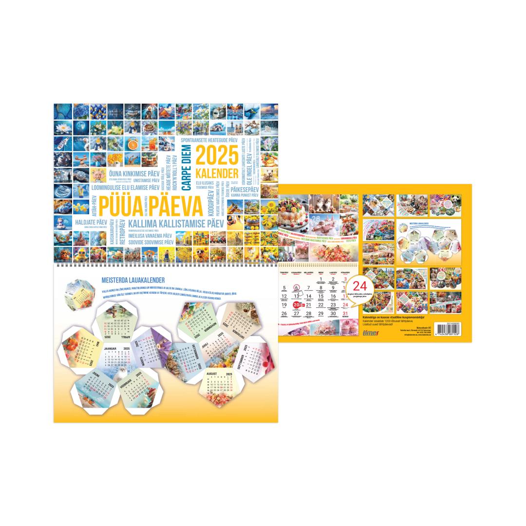 1000 fun birthdays! Instructions for making an exciting calendar ball are included. Size: 420 x 300 mm Spiral binding Hanging hole Static date marker Language: Estonian and English The calendar includes the following: Public holidays, national holidays, flag days, beginnings of seasons with times, various witty anniversaries, week number.