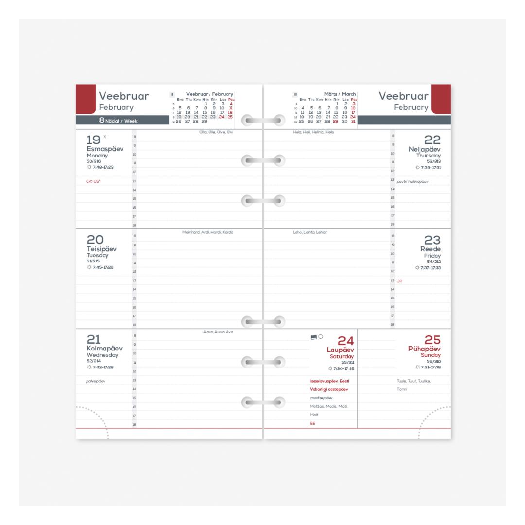 Content size: 95 x 168 mm Language: Estonian and English Perforated open pages (6 holes) Perforated page corners Suitable for the following covers: MIDI Timex