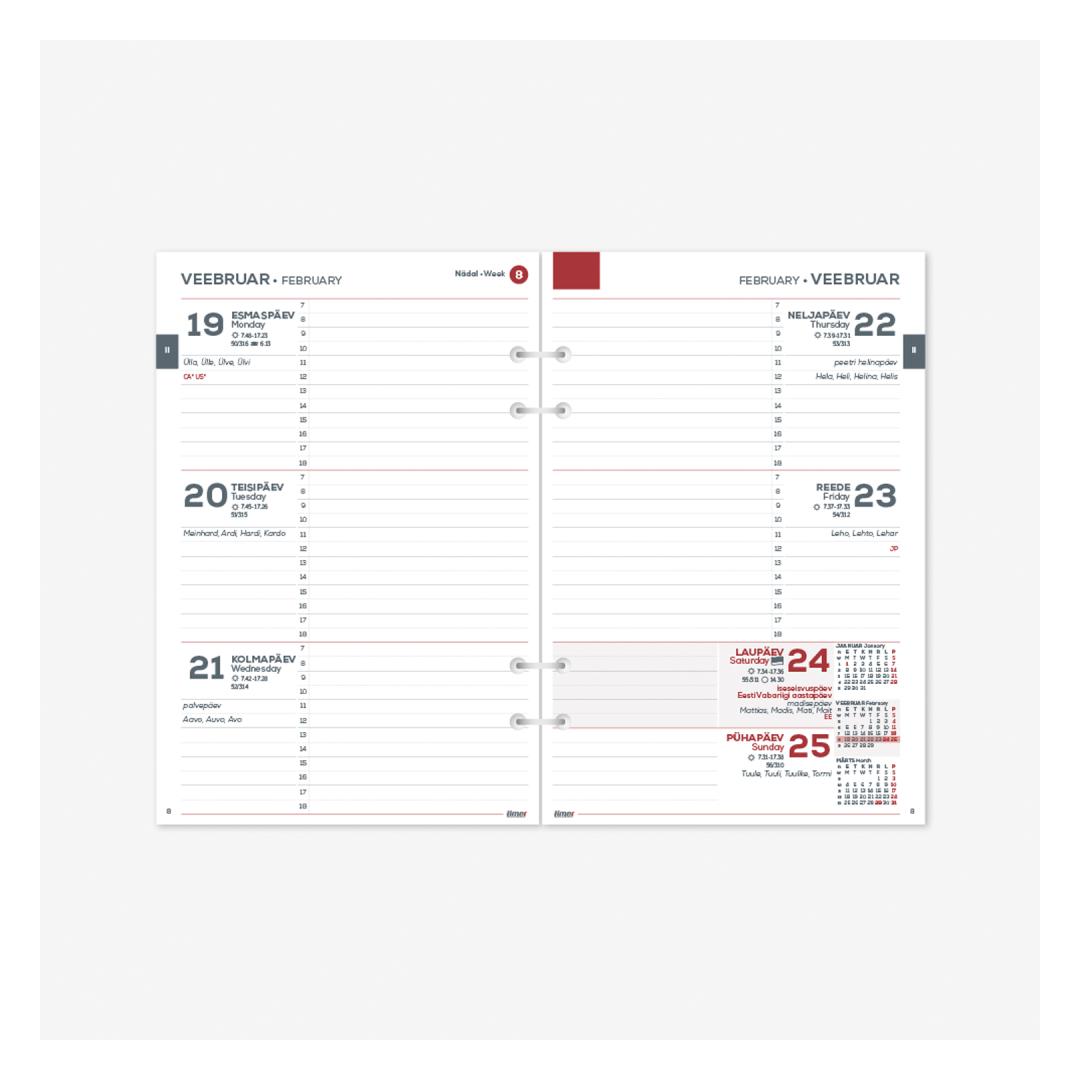 Content size: 123 x 184 mm Perforated open pages (4 holes) Language: Estonian, English, Latvian, Lithuanian, Russian Undated, square content Suitable for the following covers: ESTO-KANTSLER Leather ESTO-KANTSLER Artificial leather