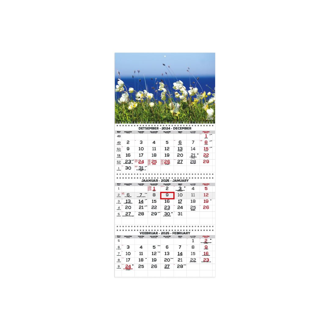 Size: 297 x 650 mm Three-part spiral binding Hanging hole Content volume 3 x 12 pages Date marker Content dark gray / red Language: Estonian and English The calendar includes the following: National holidays, national and national calendar anniversaries, flag days, national holidays of 37 countries with abbreviations, transition to summer and winter time, solar sunrise and sunset times (Tallinn), moon phases with times, zodiac signs, beginnings of seasons with times, previous and following month, week number.