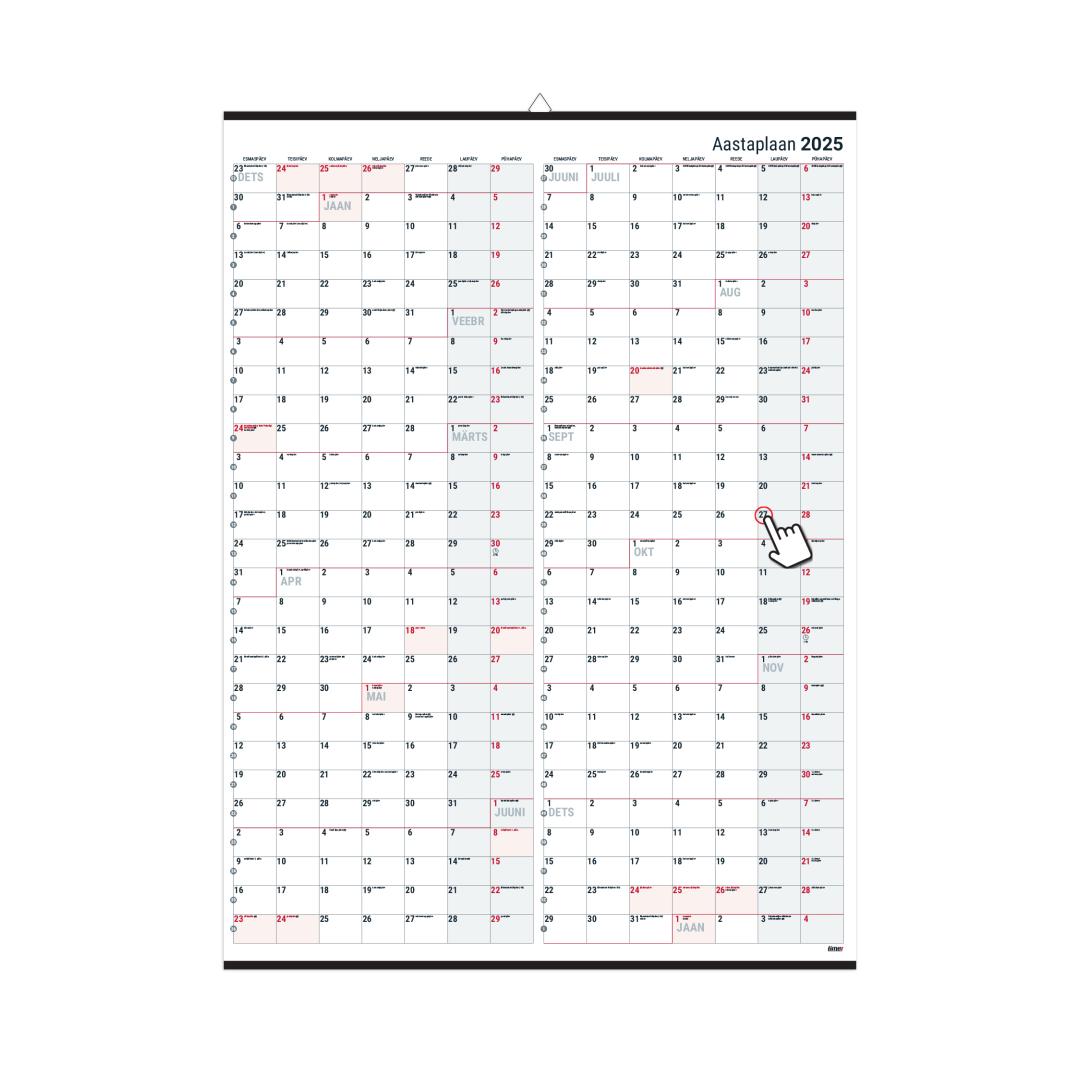 Size: 590 x 800 mm Two-color wall calendar Calendar packaged in a tube Metal fastening rim with snap loop Static date marker Language: Estonian and English ANNUAL PLAN includes the following: National holidays, national calendar dates, flag days, moon phases, information about shortened working days, transition to summer and winter time.