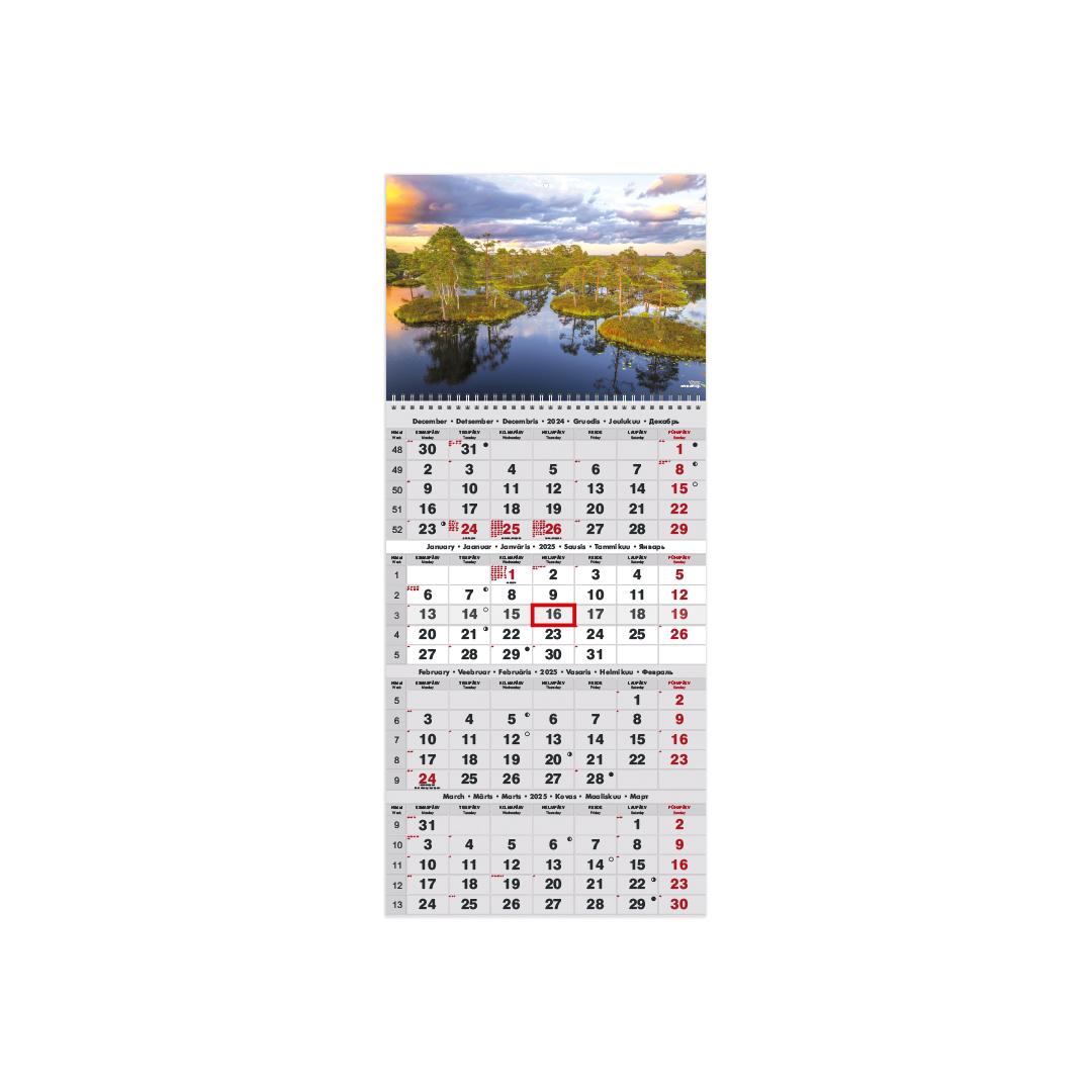 Size: 297 x 690 mm Spiral binding Hanging hole Content capacity 12 pages Date marker Content dark gray / red Language: Estonian, English, Latvian, Lithuanian, Finnish, Russian The calendar includes the following: National holidays, 37 national holidays with abbreviations, moon phases, week number, previous and 2 the following month.