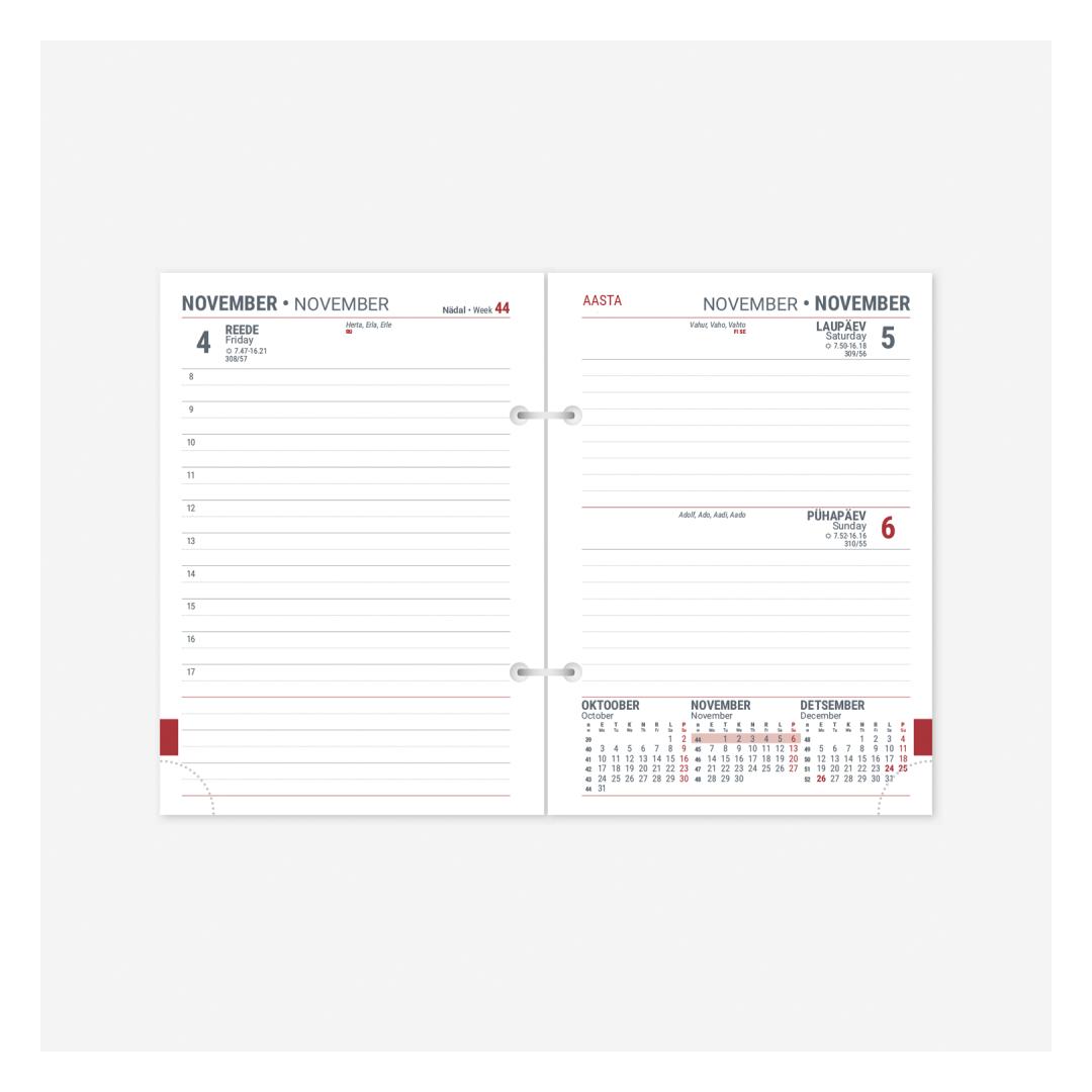 Content size: 105 x 148 mm (A6) Hole spacing: 70 mm Perforated page corners Language: Estonian and English All DESKTOP calendars include the following: Public holidays, national anniversaries, flag and name days, missing Thursdays, summer and winter time transition, national holidays of 37 countries with abbreviations, sunrise and sunset times (Tallinn), moon phases with times, zodiac signs, day list, mini calendar, week number, beginning of seasons with times. Additional pages include tabular calendar, annual plan, holiday planner, contacts, notes, world times, unit conversion, calendar legend.