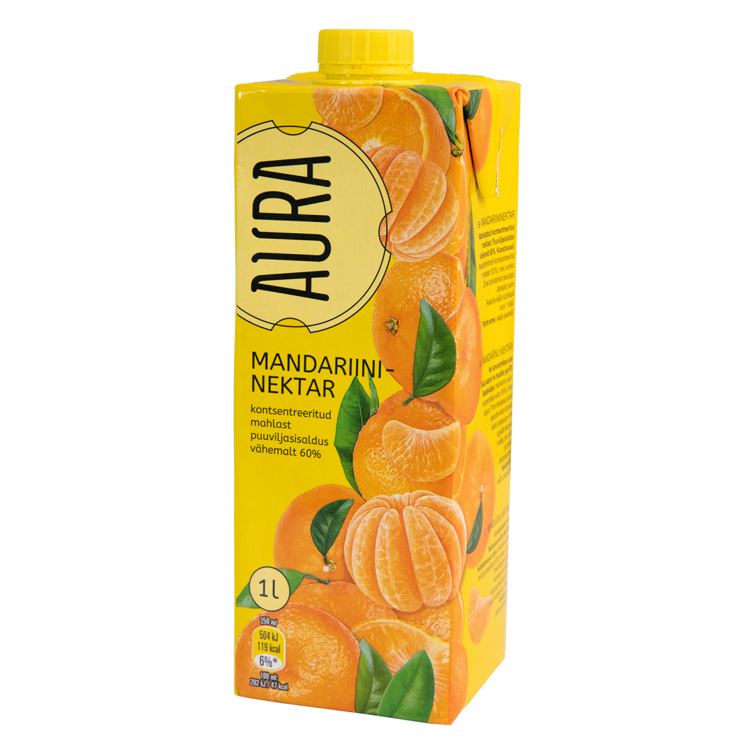AURA Mandariininektari mehutiivisteestä. Hedelmäpitoisuus vähintään 60 % Ainesosat; mandariinimehu mehutiivisteestä 60 %, vesi, sokeri. Ravista ennen tarjoilua. Paras viileä. Aurinkomandariini on kuin appelsiinin pikkuveli - yhtä kirpeän värinen mutta pienempi ja makeampi. Auran mandariininektari on valmistettu aurinkoisessa Brasiliassa kasvatetuista kypsistä mandariineista. Ei sisällä säilöntäaineita.