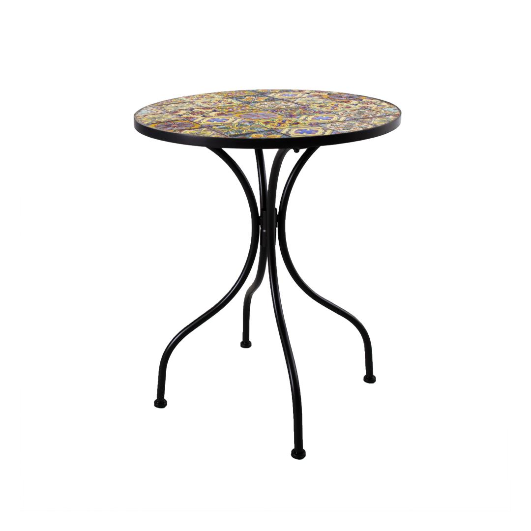 Laud MOROCCO D60xH71cm. Pöydän mosaiikkipinta on päällystetty Marokon tyyliin värillisillä keraamisilla laatoilla. Jalat ja runko on valmistettu metallista ja viimeistelty mustaksi pulverimaalattuna. Laud MOROCCO D60xH71cm. Laua mosaiikplaat on kaetud Morocco stiilis värviliste keraamiliste plaatidega. Laua jalad ja raam on valmistatud metallist ja viimistletud musta pulbervärviga.