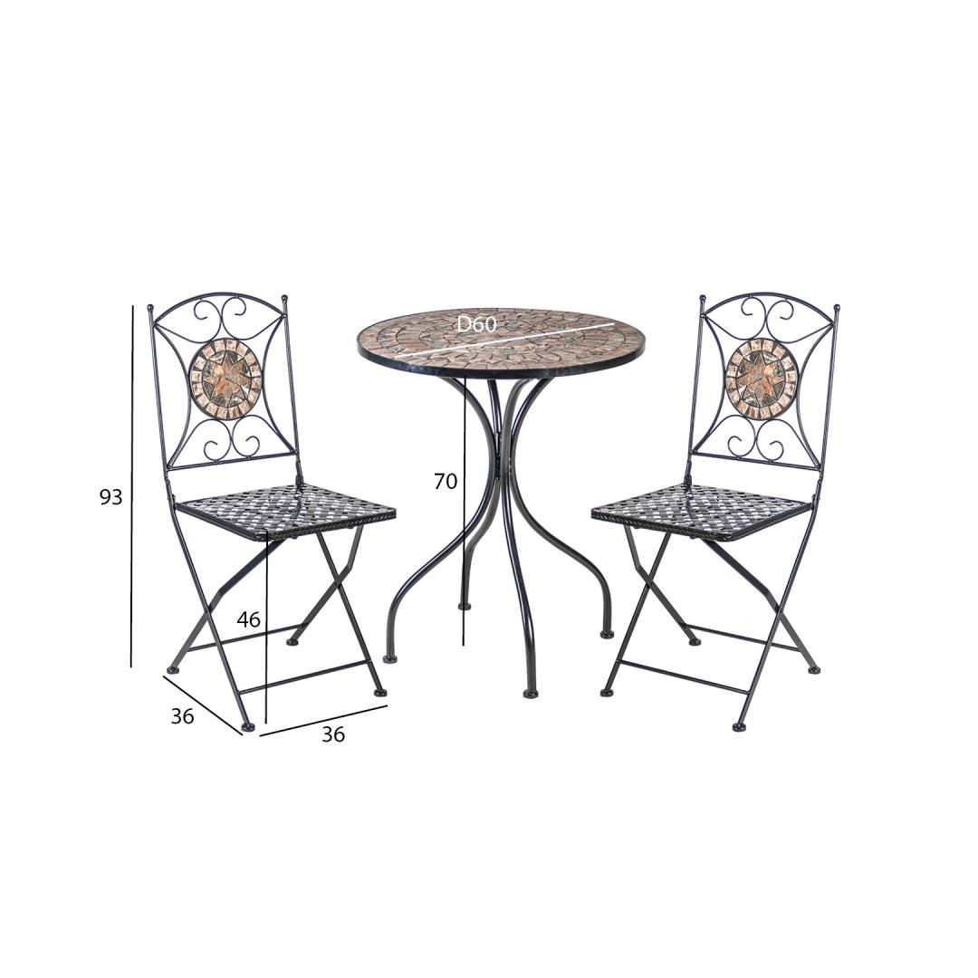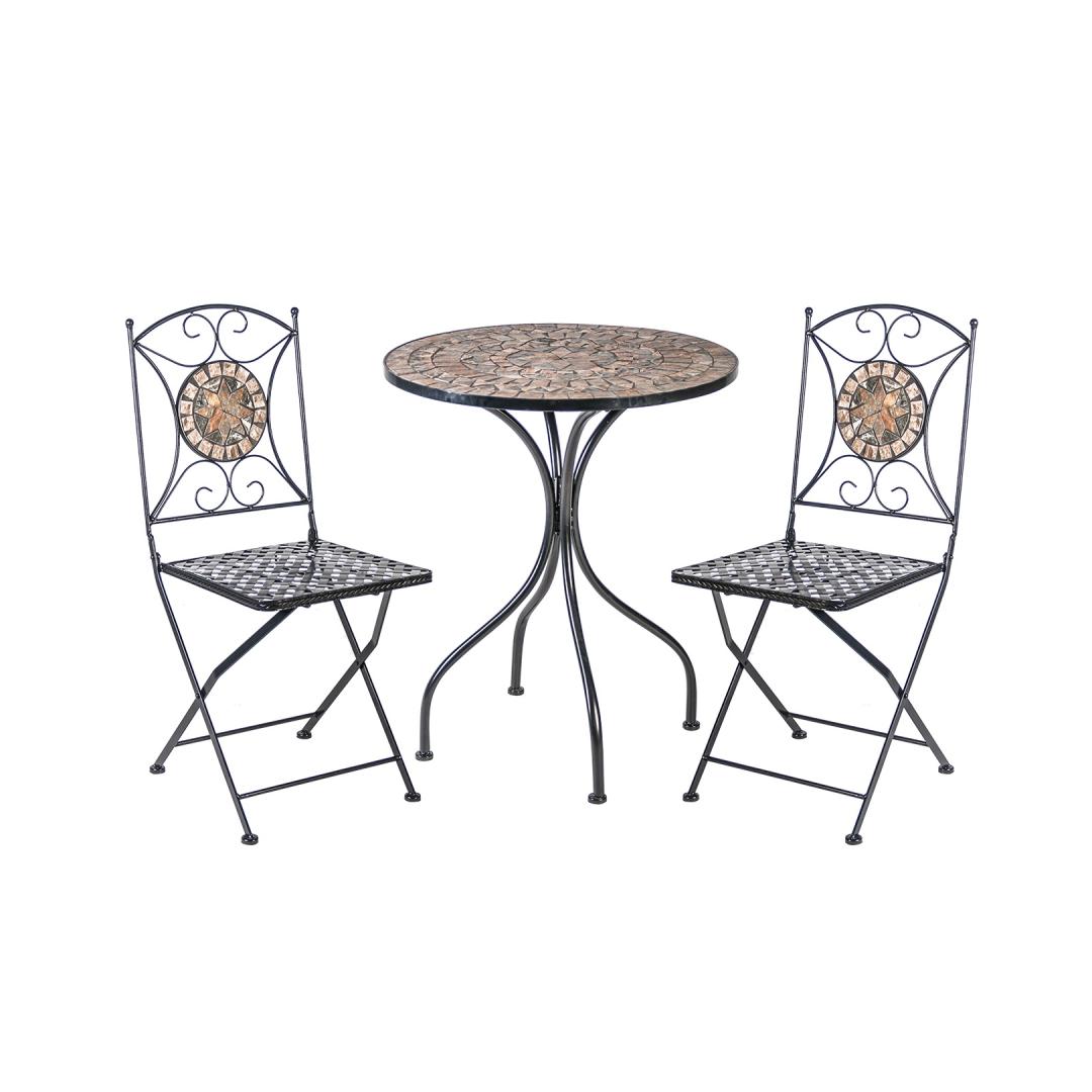 Parvekesetti MOSAIC pöytä ja 2 tuolia. Pöydän mosaiikkipinta ja taittuvien tuolien selkänojat on koristeltu ruskean ja harmaan sävyisillä keraamisilla laatoilla. Pöydän ja tuolien jalat ja runko on valmistettu metallista ja viimeistelty mustalla pulverimaalilla. Pöydän mitat ovat D60xH70cm. Tuolien kokonaismitat ovat 39x53xH90cm. Istuimen leveys 37,5cm, istuimen syvyys 38cm, istuimen korkeus 46cm. Painoraja 90kg. Tuolin mitat kokoon taitettuna ovat 38x100x11cm. HUOLTO JA HOITO: Metallikalusteet ovat käytännössä huoltovapaita, säännöllinen puhdistus riittää. Kesäkauden päätyttyä suosittelemme puutarhakalusteiden säilyttämistä sisätiloissa. Kesäkauden jälkeen kalusteet tulisi säilyttää puutarhassa. Käytä säilytykseen kuivaa ja hyvin ilmastoitua tilaa. Parvekesetti MOSAIC pöytä ja 2 tuolia. Pöydän mosaiikkipinta ja taittuvien tuolien selkänojat on koristeltu ruskean ja harmaan sävyisillä keraamisilla laatoilla. Pöydän ja tuolien jalat ja runko on valmistettu metallista ja viimeistelty mustalla pulverimaalilla. Pöydän mitat ovat D60xH70cm. Tuolien kokonaismitat ovat 39x53xH90cm. Istuimen leveys 37,5cm, istuimen syvyys 38cm, istuimen korkeus 46cm. Painoraja 90kg. Tuolin mitat kokoon taitettuna ovat 38x100x11cm. HUOLTO JA HOITO: Metallikalusteet ovat käytännössä huoltovapaita, säännöllinen puhdistus riittää. Kesäkauden päätyttyä suosittelemme puutarhakalusteiden säilyttämistä sisätiloissa. Kesäkauden jälkeen kalusteet tulisi säilyttää puutarhassa. Käytä säilytykseen kuivaa ja hyvin ilmastoitua tilaa.