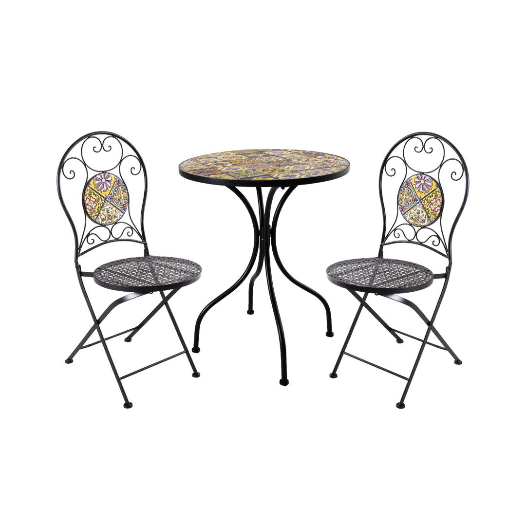 Parvekesetti MOROCCO pöytä ja 2 tuolia. Pöydän mosaiikkipinta ja taittuvien tuolien selkänojat on koristeltu värikkäillä keraamisilla laatoilla marokkolaiseen tyyliin. Pöydän ja tuolien jalat ja runko on valmistettu metallista ja viimeistelty mustalla pulverimaalilla. Pöydän mitat ovat D60xH71cm. Tuolien kokonaismitat ovat 40x51xH90cm. Istuimen leveys 38cm, istuimen syvyys 38cm, istuimen korkeus 46cm. Painoraja 90kg. Tuolin mitat kokoon taitettuna ovat 40x103x11cm. HUOLTO JA HOITO: Metallikalusteet ovat käytännössä huoltovapaita, säännöllinen puhdistus riittää. Kesäkauden päätyttyä suosittelemme puutarhakalusteiden säilyttämistä sisätiloissa. Kesäkauden jälkeen kalusteet tulisi säilyttää puutarhassa. Käytä säilytykseen kuivaa ja hyvin ilmastoitua tilaa. Parvekesetti MOROCCO pöytä ja 2 tuolia. Pöydän mosaiikkipinta ja taittuvien tuolien selkänojat on koristeltu värikkäillä keraamisilla laatoilla marokkolaiseen tyyliin. Pöydän ja tuolien jalat ja runko on valmistettu metallista ja viimeistelty mustalla pulverimaalilla. Pöydän mitat ovat D60xH71cm. Tuolien kokonaismitat ovat 40x51xH90cm. Istuimen leveys 38cm, istuimen syvyys 38cm, istuimen korkeus 46cm. Painoraja 90kg. Tuolin mitat koottuna ovat 40x103x11cm. HUOLTO JA HOITO: Metallikalusteet ovat käytännössä huoltovapaita, säännöllinen puhdistus riittää. Kesäkauden päätyttyä suosittelemme puutarhakalusteiden säilyttämistä sisätiloissa. Kesäkauden jälkeen kalusteet tulisi säilyttää puutarhassa. Käytä säilytykseen kuivaa ja hyvin ilmastoitua tilaa.