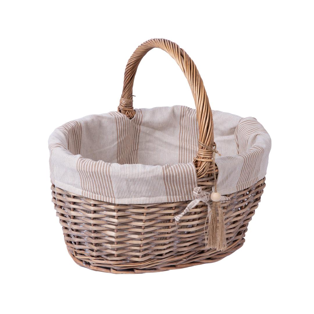 Tekstiilivuori: puuvillainen raidallinen kangas. Korin materiaali: käsin kudottu luonnonpaju.