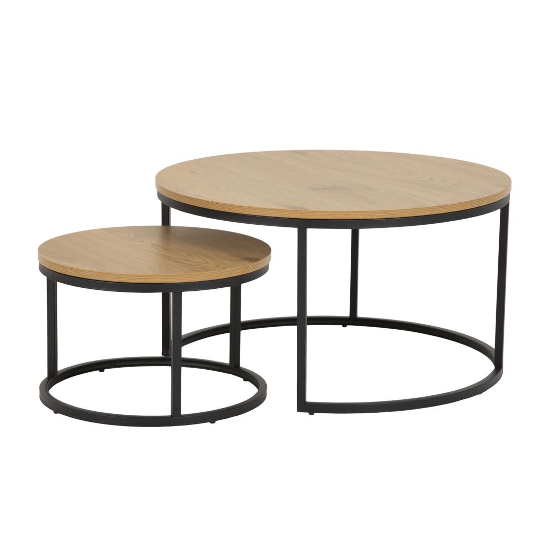 Sohvapöytä 2kpl SPIRO, D80xH45cm/D50xH33cm. Pöytälevy: tammea jäljittelevä melamiinipinta. Runko: metalli, jauhemaalattu, mattamusta. Sohvapöytä 2kpl SPIRO, D80xH45cm/D50xH33cm. Pöytälevy: tammea jäljittelevä melamiinipinta. Runko: metalli, jauhemaalattu, mattamusta.
