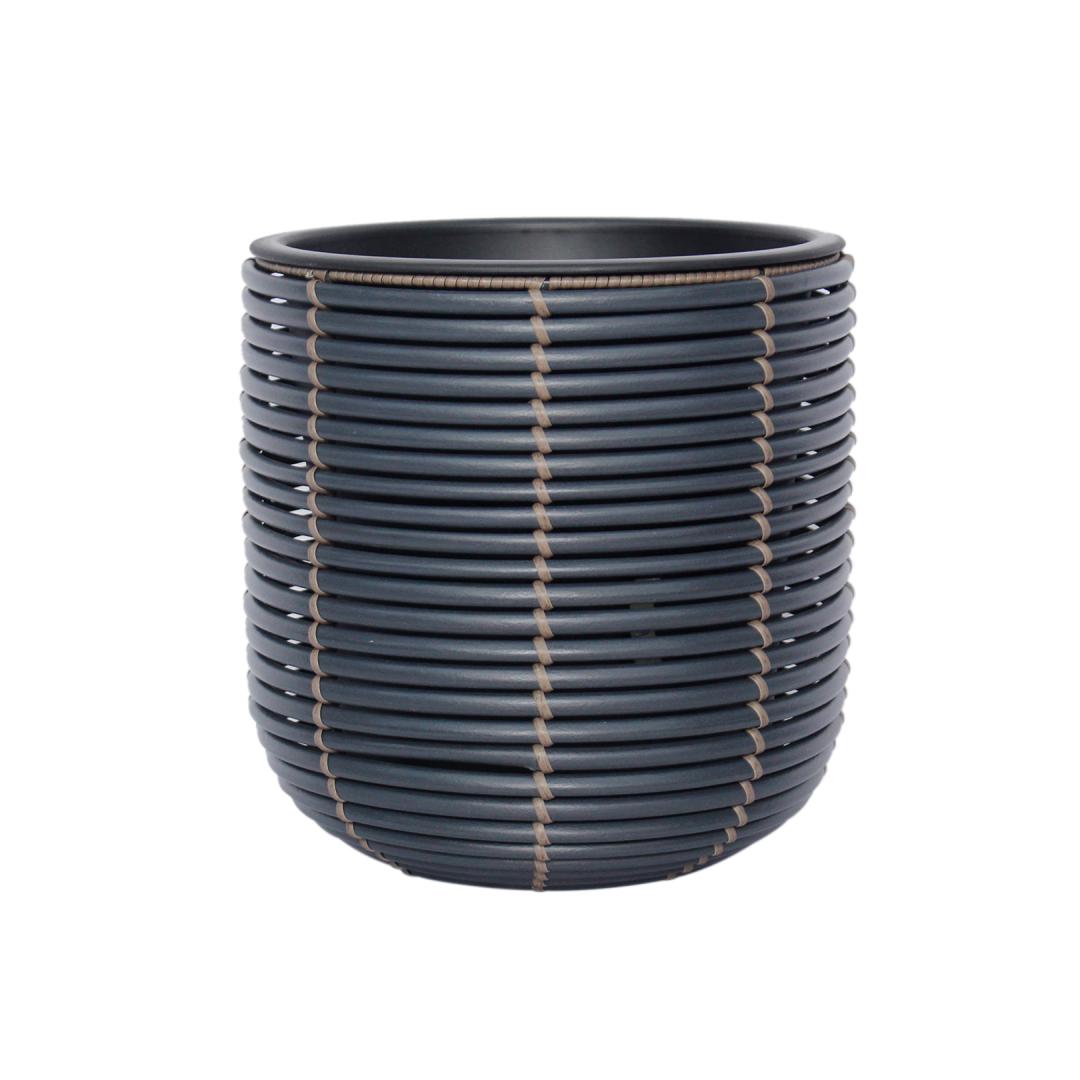 Kukkaruukku WICKER D27xH28cm, musta. Kukkaruukun metallirunko on päällystetty muovipunoksella. Sisäisen muovipussin mitat ovat D23xH23cm. Sisäpöntössä ei ole reikää.