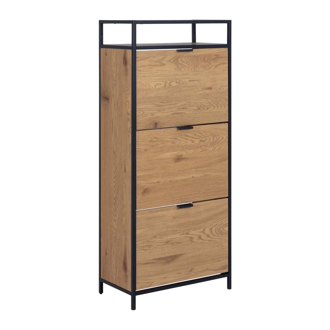 Moderni kolmilaatikkoinen kenkäkaappi. Kumpaankin laatikkoon mahtuu kaksi riviä kenkiä. Tammipintainen. Musta pulverimaalattu metallirunko ja -jalusta. Mitat 56x30xK129cm. Moderni kolmilaatikkoinen kenkäkaappi. Kumpaankin laatikkoon mahtuu kaksi riviä kenkiä. Tammipintainen. Musta pulverimaalattu metallirunko ja -jalusta. Mitat 56x30xK129cm.