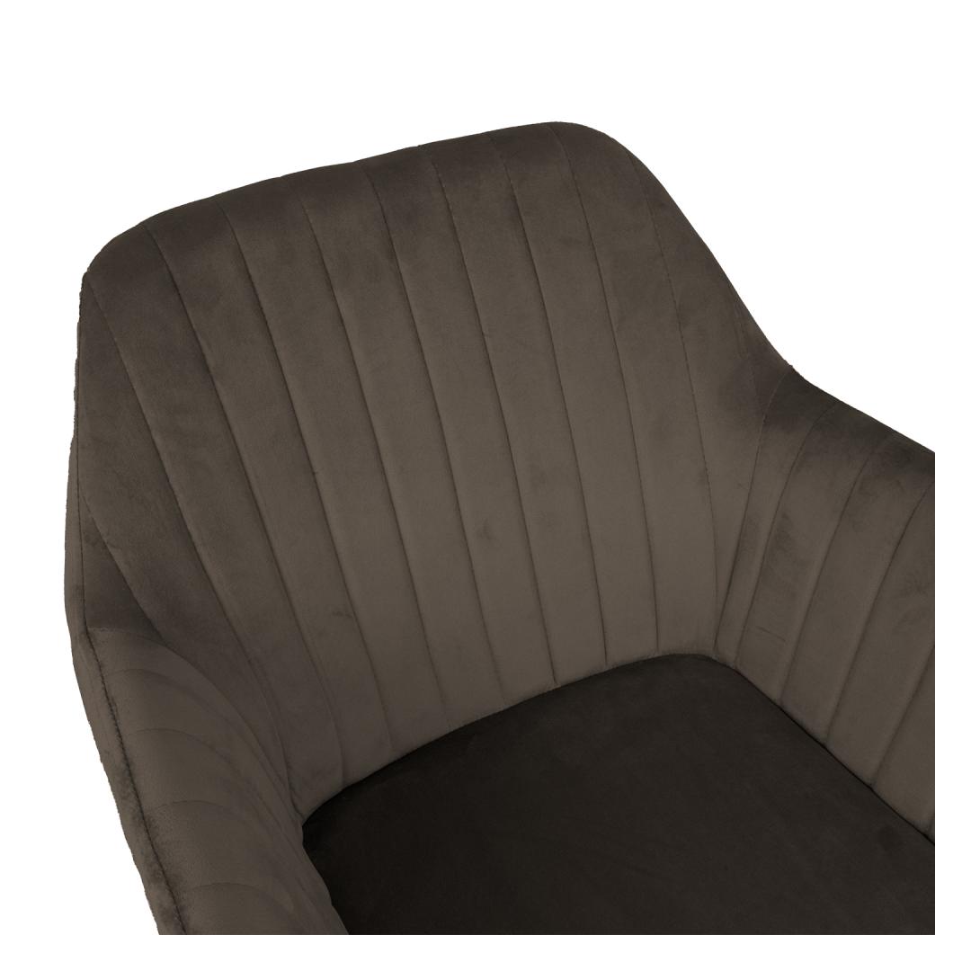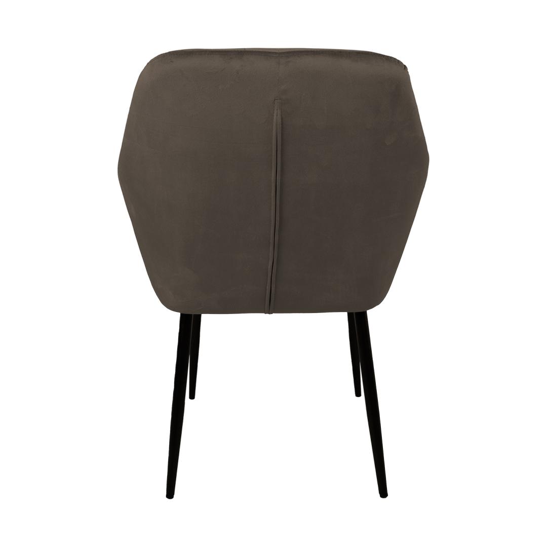 Työkalu EVELIN ruskehtavan harmaa. Istuin on kevyesti verhoiltu ja päällystetty ruskeanharmaalla samettikankaalla. Päällystemateriaali: 100 % polyesteriä. Istuimen runko: metalli ja vaneri. Verhoilu: polyuretaanivaahto. Metallijalat päällystetty mustalla pulverimaalilla. Tuolin kokonaismitat: 58x59xH81cm. Istuimen leveys 37cm, istuimen syvyys 39cm, istuimen korkeus 46cm. Käsinojan korkeus maasta 65cm. Painoraja 120kg.