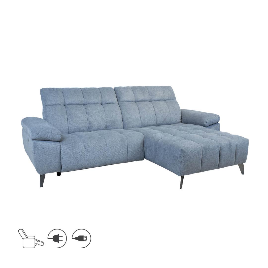 Kulmasohva LUZERN oikea kulma, sähköinen lepotuoli, siniharmaa. Toiminnallisuus on modernissa sohvassa yhtä tärkeää kuin ulkonäkö ja mukavuus. Säädettävät pää- ja jalkatuet, USB-portti ja leveät käsinojat takaavat erinomaisen mukavuuden kaikissa tilanteissa ja tunnelmissa. Sohvan pääntuet liikkuvat ylös ja alas manuaalisen mekanismin avulla. Jalkatuen asento on säädettävissä sähköisellä mekanismilla. Runko on valmistettu puusta ja vanerista. Verhoilu on valmistettu polyuretaanivaahdosta. Sohva on kokonaan verhoiltu polyesterikankaalla. Sohvan kokonaismitat ovat 264x87/160xH85cm. Istuimen leveys 103+103cm, istuimen syvyys 58/126cm, istuimen korkeus 48cm. Käsinojan korkeus maasta 65cm, käsinojan leveys 28cm. Sohvassa on metallijalat H16cm. Nurgadiivan LUZERN parem nurk, elektriline reclainer, sinakashall.