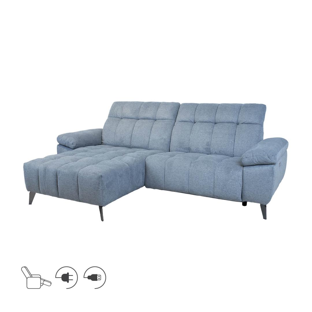 Kulmasohva LUZERN vasen kulma, sähköinen lepotuoli, siniharmaa. Toiminnallisuus on modernissa sohvassa yhtä tärkeää kuin ulkonäkö ja mukavuus. Säädettävät pää- ja jalkatuet, USB-portti ja leveät käsinojat takaavat erinomaisen mukavuuden kaikissa tilanteissa ja tunnelmissa. Sohvan pääntuet liikkuvat ylös ja alas manuaalisen mekanismin avulla. Jalkatuen asento on säädettävissä sähköisellä mekanismilla. Runko on valmistettu puusta ja vanerista. Verhoilu on valmistettu polyuretaanivaahdosta. Sohva on kokonaan verhoiltu polyesterikankaalla. Sohvan kokonaismitat ovat 264x160/87xH85cm. Istuimen leveys 103+103cm, istuimen syvyys 58/126cm, istuimen korkeus 48cm. Käsinojan korkeus maasta 65cm, käsinojan leveys 28cm. Sohvassa on metallijalat H16cm. Nurgadiivan LUZERN vasak nurk, elektriline reclainer, sinakashall.