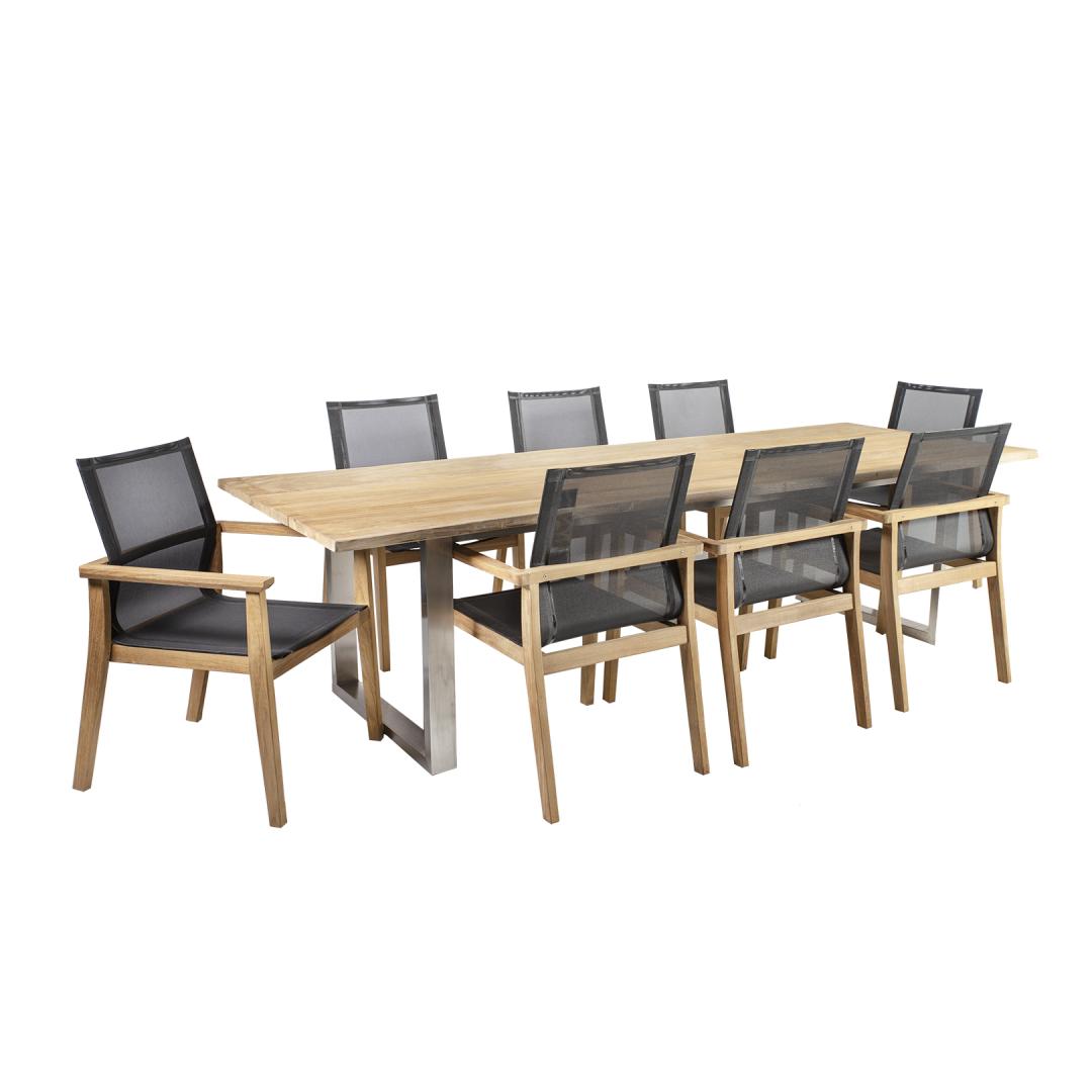 Ruokasetti NAUTICA pöytä ja 8 tuolia. Pöydän mitat 280x100xK76cm. Kolmilevyinen pöytälevy, jossa on reunattomat reunat, on valmistettu A-luokan teakista. Hienoksi kiillotettu, maalaismainen pinta on täysin luonnollisen kaunis, eikä sitä ole öljytty tai muuten kemiallisesti käsitelty. Pöydän jalat ja jalustakehikko on valmistettu ruostumattomasta teräksestä. A-luokan teak on täydellinen luonnonmateriaali ylellisiin ulkokalusteisiin. Puulla on tiheä ja tasainen puunrunko, jossa on kaunis samettinen kiilto, ja se on väriltään kultaista vehnää ja metonya. Korkean luonnollisten öljyjen pitoisuutensa ansiosta teak kestää hyvin kosteutta ja puutuholaisia. Se kestää hyvin monenlaisia sääolosuhteita ja säilyttää erinomaisen ulkonäkönsä ja parhaat ominaisuutensa useita vuosia. Auringonvalo ja kosteus muuttavat pöydän pinnan ajan myötä kauniiksi hopeanharmaaksi. Tämä värimuutos on luonnollista eikä vaikuta puun laatuun. Eksklusiivinen lammikkopuupöytä soveltuu myös sisäkäyttöön. Tuolin runko on valmistettu hienoksi hiotusta, öljyttömästä teakista. Istuin ja selkänoja ovat mustaa batyliinia. Batylin-materiaalin tärkein ominaisuus on sen notkeus ja optimaalinen istumamukavuus. Poikkeuksellisen mekaanisen lujuuden lisäksi materiaalilla on korkea kemiallinen kestävyys. Synteettinen päällinen takaa erittäin hyvän sään- ja UV-kestävyyden. Batyline ei ime itseensä kosteutta, minkä vuoksi materiaali kuivuu erittäin nopeasti, on erittäin tahran- ja homeenkestävä ja helppo puhdistaa. Tuolin kokonaismitat ovat 64x65xH90cm. Istuimen leveys 47,5cm, istuimen syvyys 48cm, istuimen korkeus 43cm. Selkänojan korkeus 48cm, käsinojan korkeus 66cm. Painoraja 120kg. Tuolit ovat pinottavia. HUOLTO: puhdista säännöllisesti, suojaa kosteudelta ja UV-säteiltä. Puupinnat voidaan haluttaessa hioa kevyesti raikastamaan niitä. HUOLTO: kesäkauden päätyttyä suosittelemme puutarhakalusteiden säilyttämistä sisätiloissa. Kesäkauden päätyttyä on suositeltavaa jättää huonekalut puutarhaan jäähtymään ja kuivumaan ennen varastointia. Käytä säilytykseen kuivaa ja hyvin ilmastoitua tilaa. Ruokasetti NAUTICA pöytä ja 8 tuolia. Pöydän mitat 280x100xK76cm. Kolmilevyinen pöytälevy, jossa on reunattomat reunat, on valmistettu A-luokan teakista. Hienoksi kiillotettu, maalaismainen pinta on täysin luonnollisen kaunis, eikä sitä ole öljytty tai muuten kemiallisesti käsitelty. Pöydän jalat ja jalustakehikko on valmistettu ruostumattomasta teräksestä. A-luokan teak on täydellinen luonnonmateriaali ylellisiin ulkokalusteisiin. Puulla on tiheä ja tasainen puunrunko, jossa on kaunis samettinen kiilto, ja se on väriltään kultaista vehnää ja metonya. Korkean luonnollisten öljyjen pitoisuutensa ansiosta teak kestää hyvin kosteutta ja puutuholaisia. Se kestää hyvin monenlaisia sääolosuhteita ja säilyttää erinomaisen ulkonäkönsä ja parhaat ominaisuutensa useita vuosia. Auringonvalo ja kosteus muuttavat pöydän pinnan ajan myötä kauniiksi hopeanharmaaksi. Tämä värimuutos on luonnollista eikä vaikuta puun laatuun. Eksklusiivinen lammikkopuupöytä soveltuu myös sisäkäyttöön. Tuolin runko on valmistettu hienoksi hiotusta, öljyttömästä teakista. Istuin ja selkänoja ovat mustaa batyliinia. Batylin-materiaalin tärkein ominaisuus on sen notkeus ja optimaalinen istumamukavuus. Poikkeuksellisen mekaanisen lujuuden lisäksi materiaalilla on korkea kemiallinen kestävyys. Synteettinen päällinen takaa erittäin hyvän sään- ja UV-kestävyyden. Batyline ei ime itseensä kosteutta, minkä vuoksi materiaali kuivuu erittäin nopeasti, on erittäin tahran- ja homeenkestävä ja helppo puhdistaa. Tuolin kokonaismitat ovat 64x65xH90cm. Istuimen leveys 47,5cm, istuimen syvyys 48cm, istuimen korkeus 43cm. Selkänojan korkeus 48cm, käsinojan korkeus 66cm. Painoraja 120kg. Tuolit ovat pinottavia. HUOLTO: puhdista säännöllisesti, suojaa kosteudelta ja UV-säteiltä. Puupinnat voidaan haluttaessa hioa kevyesti raikastamaan niitä. HUOLTO: kesäkauden päätyttyä suosittelemme puutarhakalusteiden säilyttämistä sisätiloissa. Kesäkauden päätyttyä on suositeltavaa jättää huonekalut puutarhaan jäähtymään ja kuivumaan ennen varastointia. Käytä säilytykseen kuivaa ja hyvin ilmastoitua tilaa.