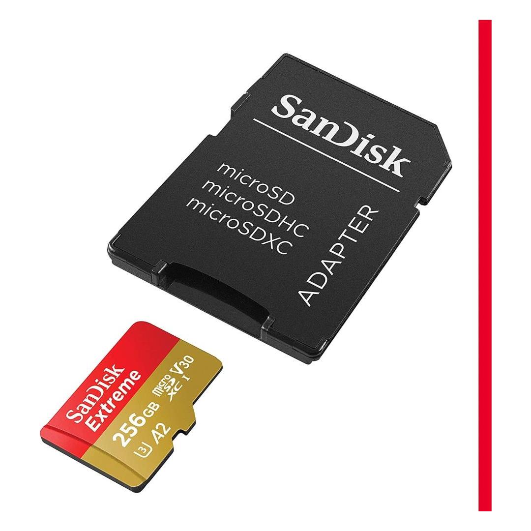 Nopeusluokka UHS-3, Mukana SD-sovittimet/lukijat SanDisk Extreme microSDXC 256GB + SD-sovitin + 1 vuosi RescuePRO Deluxe jopa 190MB/s & 130MB/s luku- ja kirjoitusnopeudet A2 C10 V30 UHS-I U3.