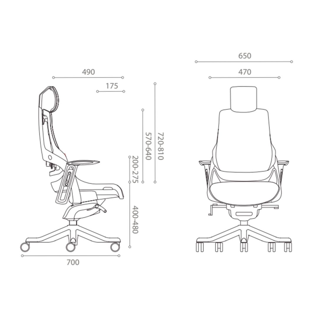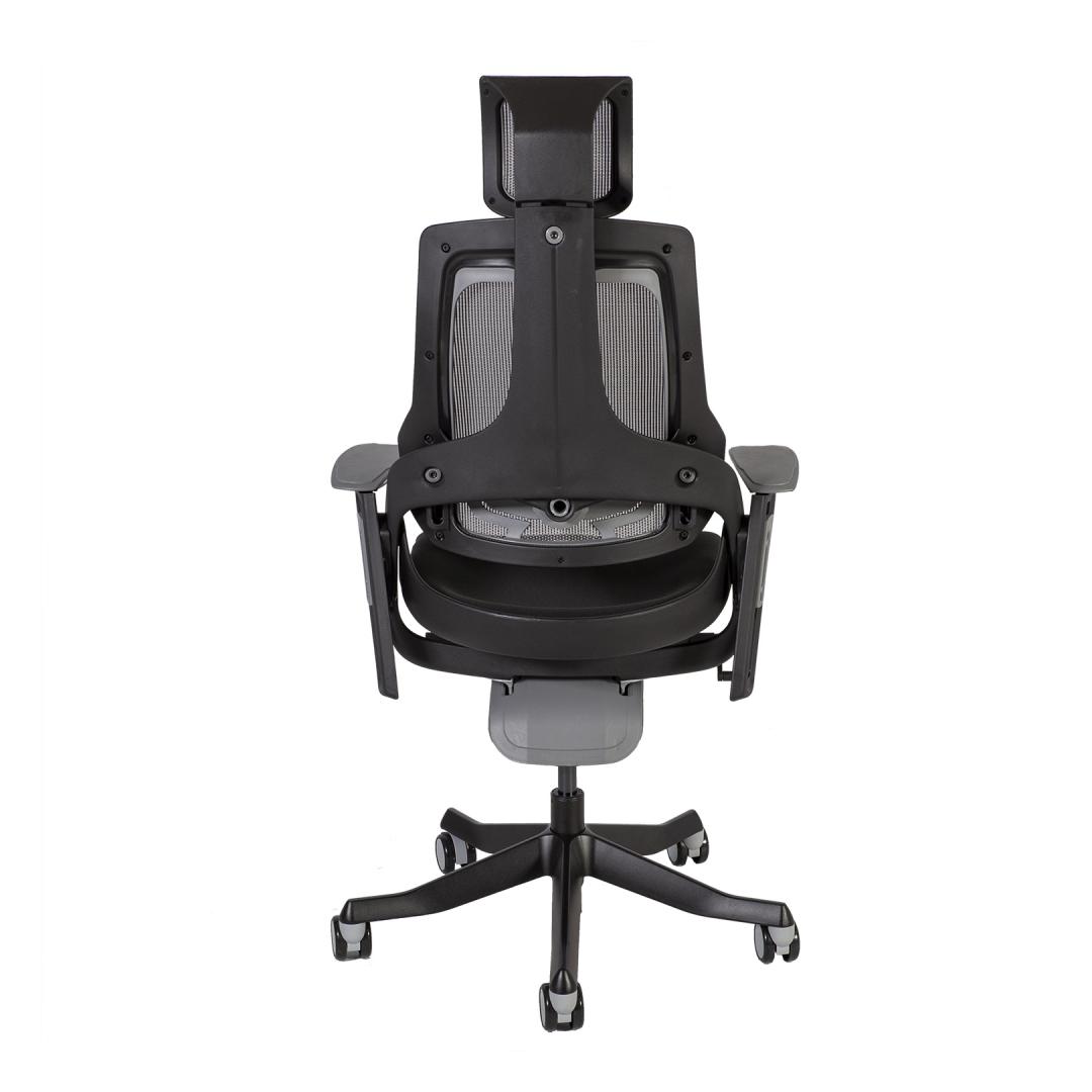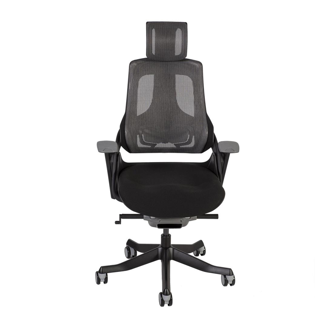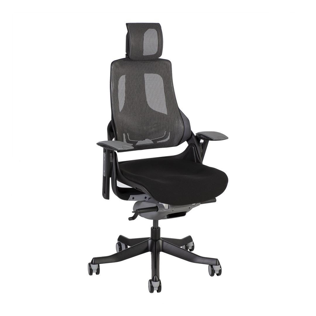Työtuoli WAU musta/harmaa. WAU yhdistää erinomaisen ergonomian ja urheilullisen tyylin ja tarjoaa parhaan mahdollisen tuen ja tyytyväisyyden koko työpäivän ajan. Tuolin ulkorunko on mustaa muovia ja rungon sisäosat on valettu harmaasta muovista (100 % kierrätettävä PP). Selkänojan muovirunko on vahvistettu lasikuidulla. Tuolin verhoiltu istuinosa on päällystetty mustalla polyesterikankaalla, Martindale-arvo 50 000. Tuolin selkänoja on päällystetty hengittävällä harmaalla verkkokankaalla (76 % polyelastomeeria, 24 % polyesteriä), Martindale-arvo 100 000. Verkon elastomeeriset filamenttikuidut takaavat suuren vetolujuuden ja erinomaisen kestävyyden. Tuolissa on synkronoitu mekanismi. Selkänojan kulma on lukittavissa ja kaltevuus säädettävissä. Istuimen korkeus on säädettävissä kaasujousen avulla. Pääntuen ja selkänojan korkeus on säädettävissä. Tuolissa on säädettävä lannerangan tuki. Käsinojien päälliset ovat harmaata elastomeeristä kestomuovia. Käsinojien korkeus ja kääntyvyys ovat säädettävissä. Tuolin 5-vartinen jalusta on valmistettu valetusta alumiinista ja viimeistelty mustalla epoksijauhemaalilla. Tuolissa on 60 mm:n lattiaa säästävät nailonpyörät. Tuolin kokonaismitat ovat 70x70xK112-129cm. Istuimen leveys 47cm, istuimen syvyys 49cm, istuimen korkeus 40-48cm. Painoraja 120kg.