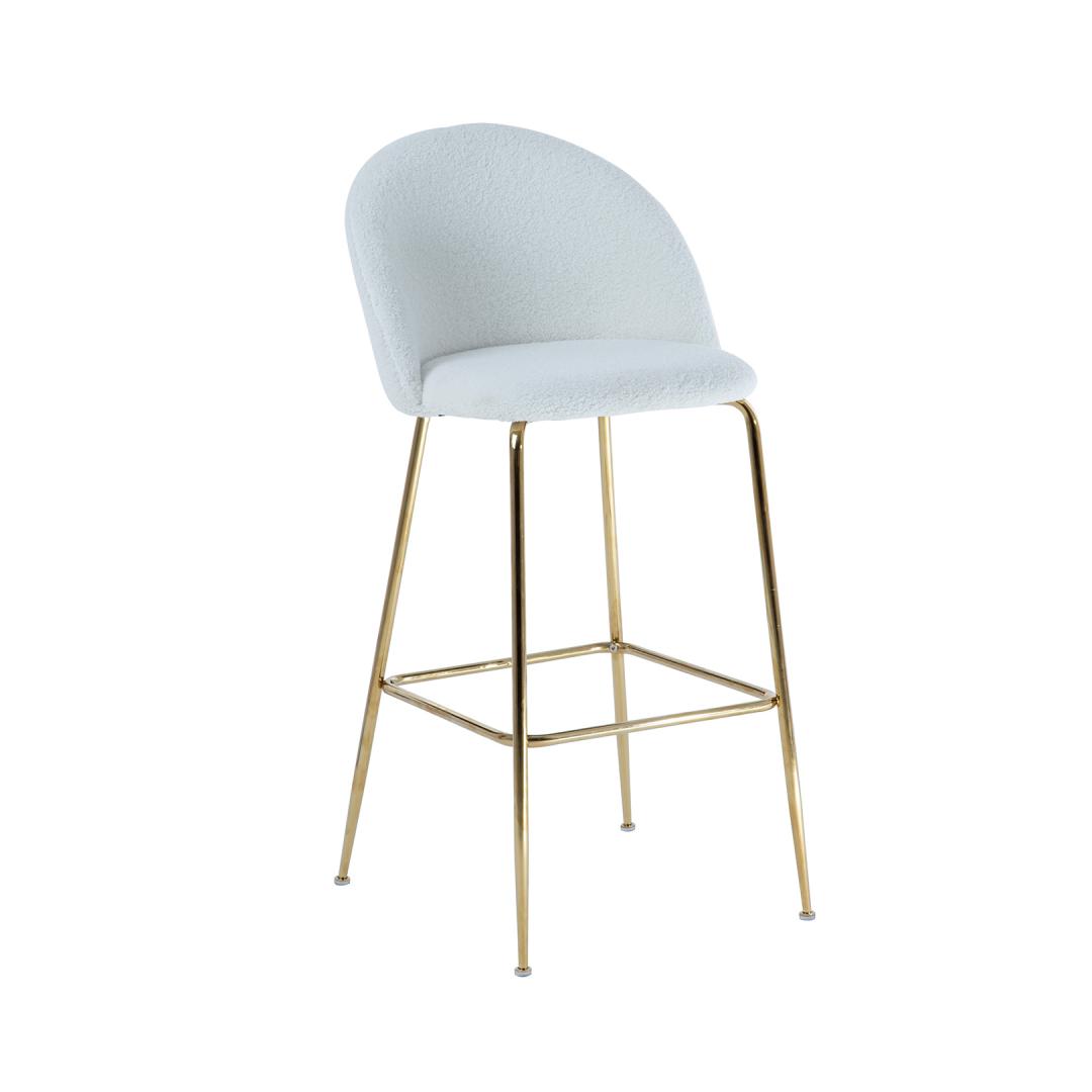 Baarijakkara BEETLE, valkoinen. Ylellisen näköinen, tyylikäs ja mukava BEETLE-tuoli piristää mitä tahansa huonetta ja luo lämpimän, kodikkaan tunnelman. Istuin ja selkänoja on verhoiltu ja päällystetty laadukkaalla, pehmeällä muhkealla kankaalla. Verhoilumateriaali: 100 % polyesteriä, 400 g/m². Metallijalat on viimeistelty kultaisella pulverimaalilla. Tuolin kokonaismitat ovat 52x54xK105cm, istuimen leveys 47cm, istuimen syvyys 41cm, istuimen korkeus 75cm. Selkänojan korkeus 33cm, jalkatuen korkeus 30cm. Painoraja 100kg.