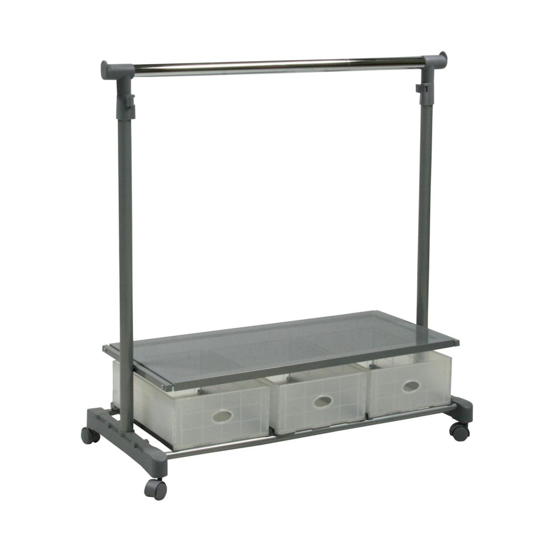Tanko FORD, 3 laatikkoa 94x42xH93,5-168cm, hopea/kromi. Pyörillä varustettu korkeussäädettävä teline on yksinkertainen ja käytännöllinen ratkaisu vaatteiden ja jalkineiden järjestämiseen. Pohjakehys on valmistettu hopeanvärisestä muovista, sivutangot ja ripustusputki kromatusta teräksestä. Tolpan alaosassa on 3 muovista laatikkoa 36x25xH12cm ja metallinen hylly. Kantavuus 15kg.