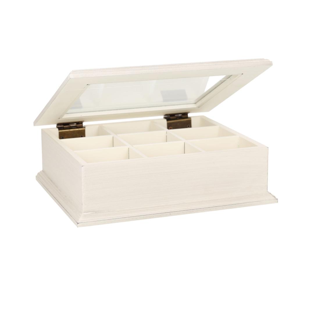 Teerasia SAMIRA 26,5x22x8,5cm, antiikkivalkoinen. Valmistettu paulowniapuusta ja viimeistelty antiikkivalkoiseksi. Rasiassa on lasinen kansi ja 9 lokeroa teepusseille.
