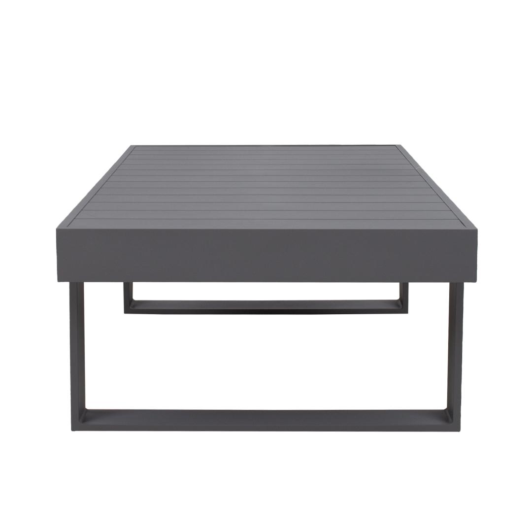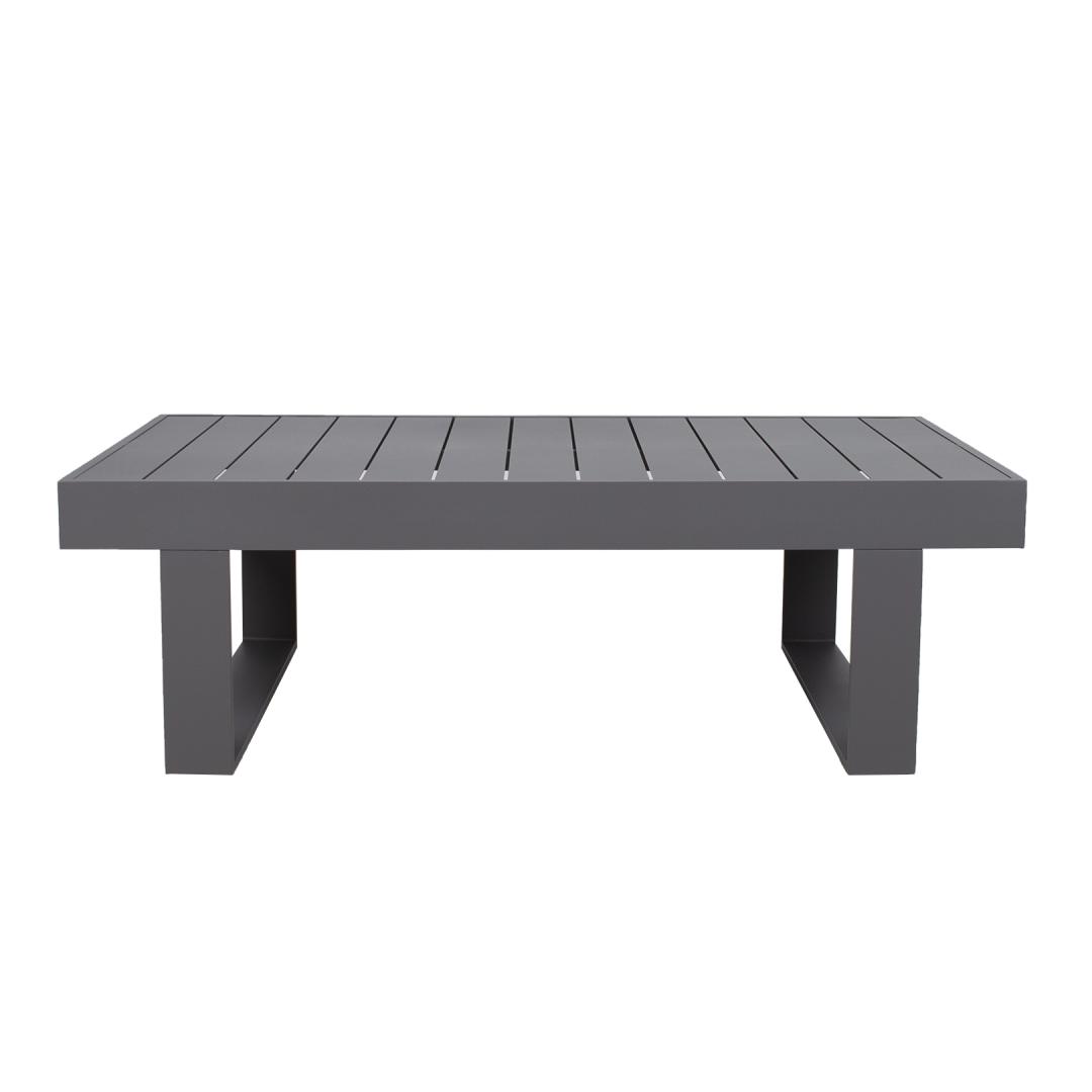Sohvapöytä FLUFFY 133x73,5xH42cm, harmaa. Pöytälevy ja runko alumiinia ja viimeistelty harmaalla pulverimaalilla. Tuote kestää hyvin vaihtelevia sääolosuhteita ja on helppo huoltaa.