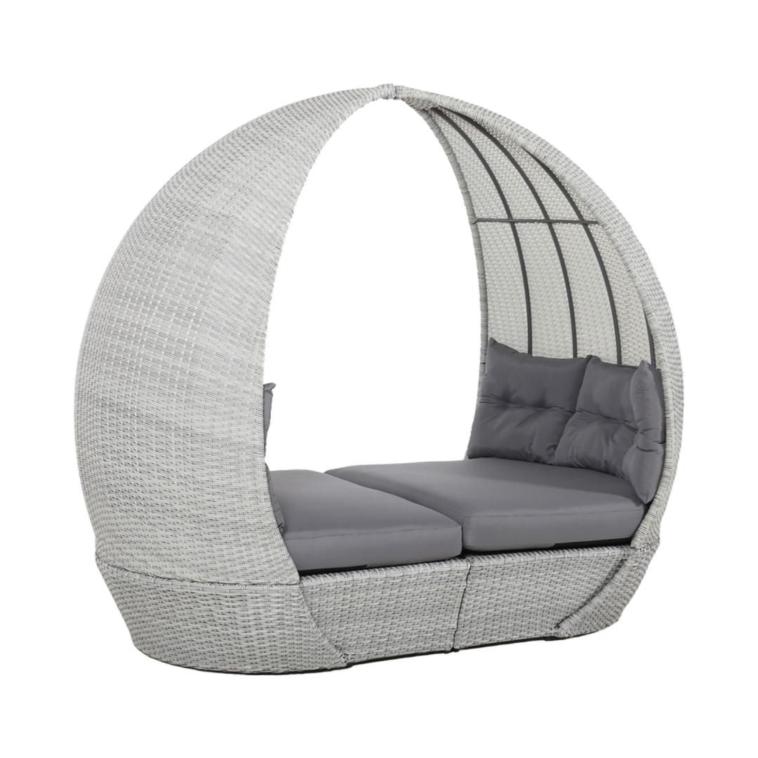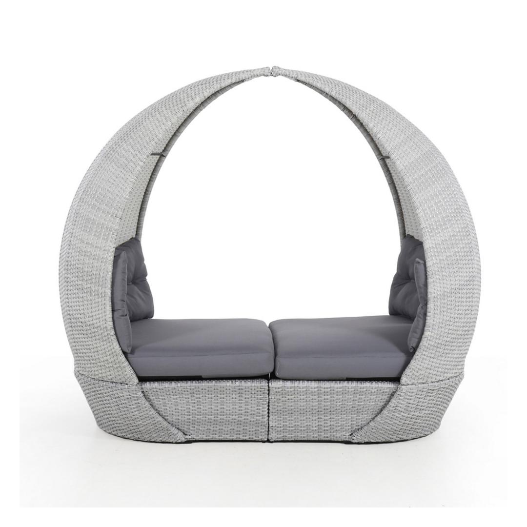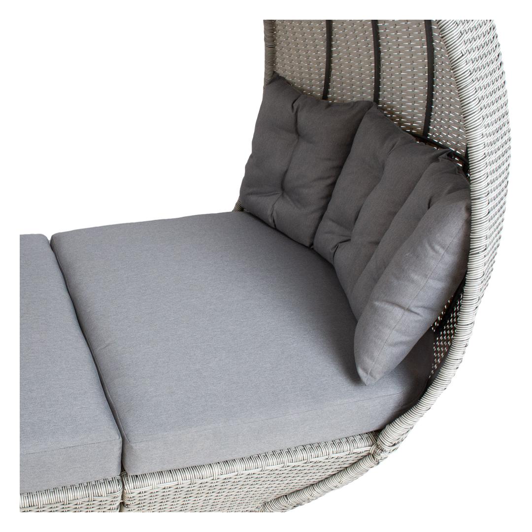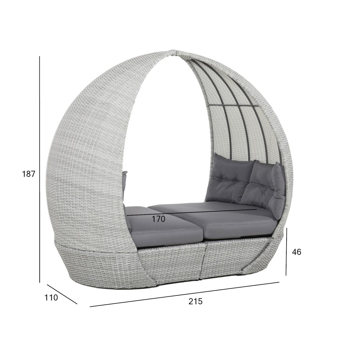Lebola ASCOT 215x110xH187cm, harmaa. Lebolan alumiinirunko päällystetty harmaalla muovipunoksella. Istuimen mitat 136/200x110cm, istuinkorkeus tyynyn kanssa 46cm. Kaareva istuintyyny koostuu kahdesta puolikkaasta. Istuintyynyn mitat 68/100x110xH13cm - 2kpl. Selkänojatyynyn mitat 118x50x8cm - 2kpl. Tyynyt on valmistettu harmaasta olefiinikankaasta. Tuote kestää vaihtelevia sääolosuhteita ja on erittäin helppohoitoinen, ainoastaan tyynyt tarvitsevat suojaa säältä. HUOLTO: Kesäkauden päätyttyä suosittelemme puutarhakalusteiden säilyttämistä sisätiloissa. Kauden päätyttyä puutarhakalusteet tulisi säilyttää puutarhassa. Säilytä viileässä, kuivassa ja hyvin ilmastoidussa tilassa.