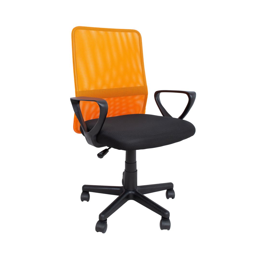 Työtuoli BELINDA black/oranþ. Kevyesti verhoiltu tuoli, jossa istuinosa polyesterikangasta ja selkänoja polyesteriverkkoa. Istuimen korkeus on säädettävissä kaasunarulla. Käsinojat mustaa muovia. jalkatuki mustaa muovia, R27cm, 5 käsinojaa. Tuolissa on muovipyörät, 50mm. Tuolin korkeus 86,5-98,5cm, istuimen leveys 46,5cm, istuimen syvyys 46,5cm, selkänojan leveys 44cm, selkänojan korkeus 55,5cm. Mitat. Tuotteen mitat ovat 59x56xH86,5-98,5cm. Tuolin painorajoitus 80kg.