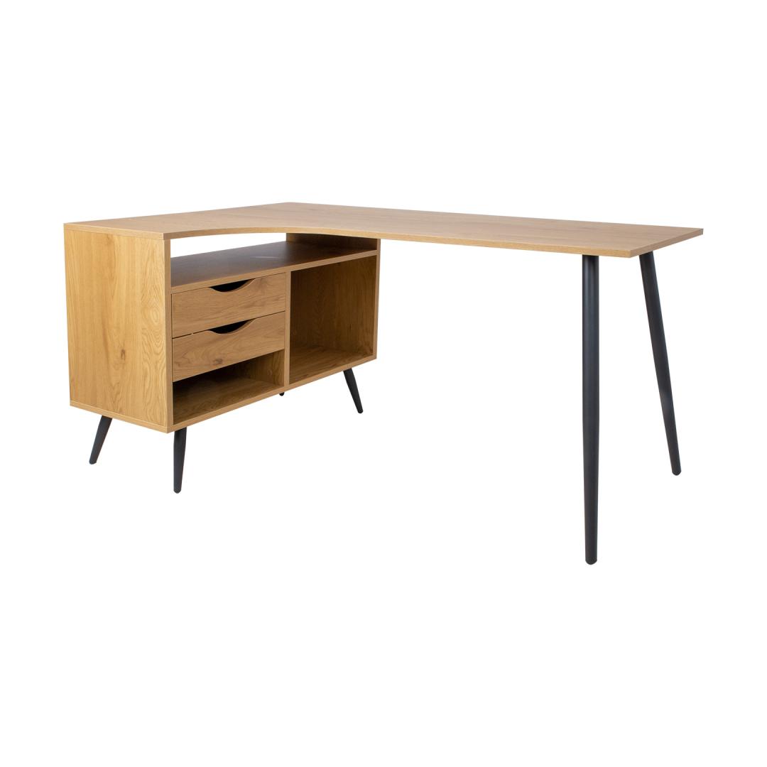Työpöytä GEORGIA 145x80xK75cm, melamiinia ja tammipinta. Valmistettu melamiinipinnoitetusta huonekalulevystä. Pöydän jalat ovat metallia ja viimeistelty mustalla pulverimaalilla. Pöytälevyn alla on kaksi laatikkoa ja kolme erikokoista avohyllyä. Laatikoiden liukukiskot ovat äänettömästi sulkeutuvia. Lyhyempien jalkojen korkeus on 20cm.