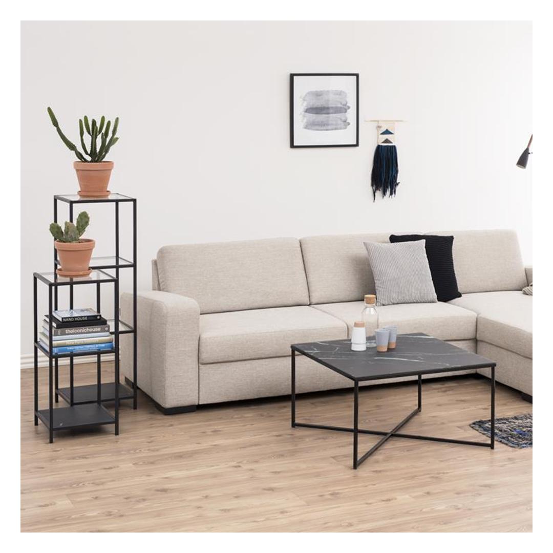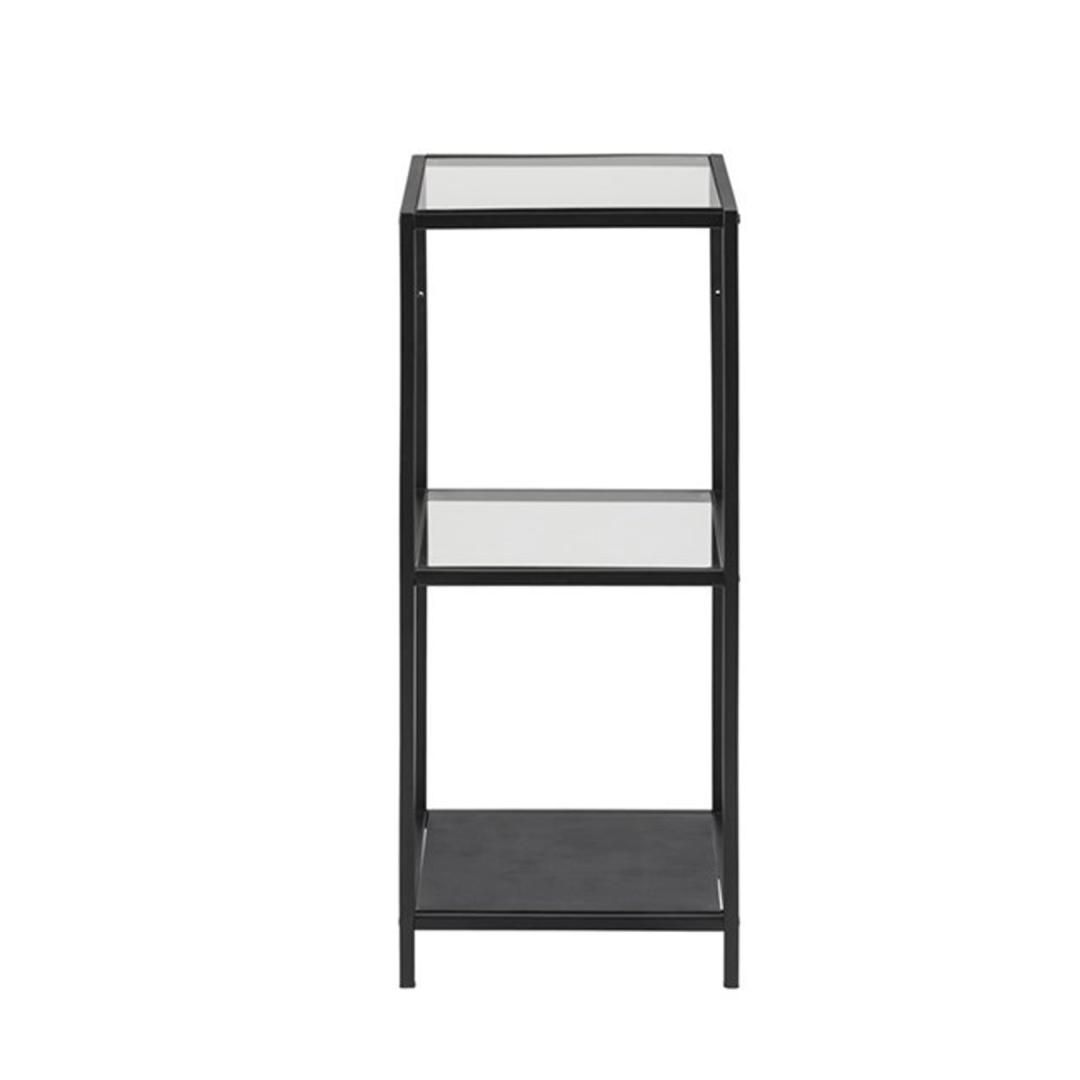 Hylly SEAFORD 35x37xH82,5cm, lasi. Tätä tyylikästä ja käytännöllistä hyllyä voidaan käyttää eri huoneissa kätevästi säilytykseen. Hylly on valmistettu läpinäkyvästä ja mattamustasta 5mm paksusta lasista. Runko on valmistettu mustan värisestä metallista. Tuotteen mitat ovat 35x37xH82,5cm.