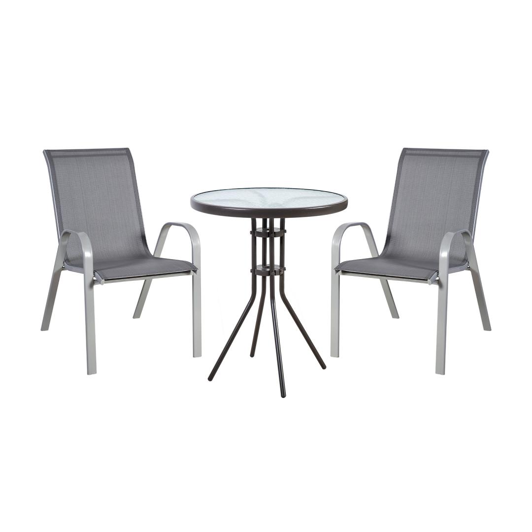 Puutarhakalustesarja DUBLIN pöytä ja 2 tuolia, harmaa. Pöydän mitat D60xH70cm. Pöytälevy: 5mm kirkas aaltolasi. Pöydän runko ja jalat terästä ja viimeistelty tummanruskealla pulverimaalilla. Pöytä on valmistettu mustasta ja harmaasta puusta, jossa on tummanharmaa viimeistely ja mustaksi maalattu pinta. Tuolien tekstiiliistuin päästää ilman läpi, kuivuu nopeasti ja on helppo puhdistaa. Tuolin runko ja jalat on valmistettu teräksestä ja viimeistelty harmaalla pulverimaalilla. Tuolit ovat pinottavia, joten ne on helppo ja tilaa säästävästi säilyttää. Tuolin kokonaismitat ovat 55,5x73xH90cm. Istuimen leveys 45cm, istuimen syvyys 41cm, istuimen korkeus 44cm. Selkänojan korkeus 57cm. Käsinojan korkeus maasta 61cm. Painoraja 100kg.