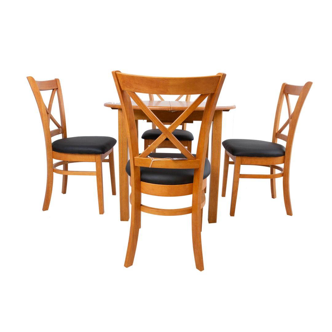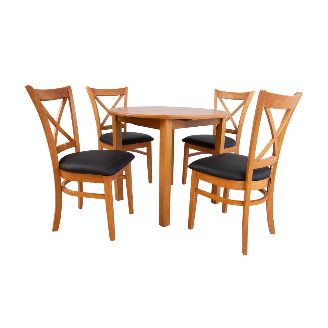 MIX & MATCH-ruokapöydän setti, jossa on jatkettava pöytä ja 4 tuolia. Pöydän mitat D90+30xH74cm. Pöytä on valmistettu kumipuusta ja viimeistelty vaalealla tammilakalla. Pöytälevy aukeaa keskeltä ja jatkopöytä asetetaan kahden sivun väliin. pöytälevyn alle sijoitetaan 30 cm leveä kokoontaitettava välilevy. Tuolin mitat ovat 43x43xH90,5cm. Pehmustettu istuin on päällystetty mustalla keinonahalla. Kumipuujalat ja runko on viimeistelty vaalealla tammilakalla. Painoraja 100kg.