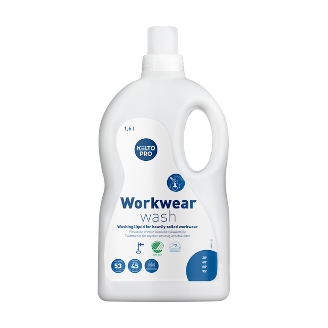 Kiilto Pro Workwear Wash on pesuaine, joka on suunniteltu erityisesti voimakkaasti likaantuneiden työvaatteiden pesuun.