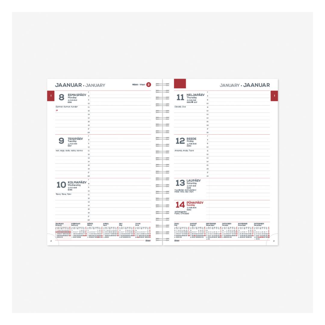 Koko: 145 x 210 mm (A5) Kieli: viro ja englanti Kierresidonta Rei'itetyt kulmat Sopii seuraaviin kansiin: MINISTER PVC Week MINISTER Spirex MINISTER Trend MINISTER Flex MINISTER Exclusive MINISTER Pattern MINISTER Embroidery MINISTER Linen MINISTER Twine MINISTER Majestic MINISTER 18 MONTHS Flex UNIKA Spirex UNIKA Trend UNIKA Flex UNIKA Flex UNIKA Flex