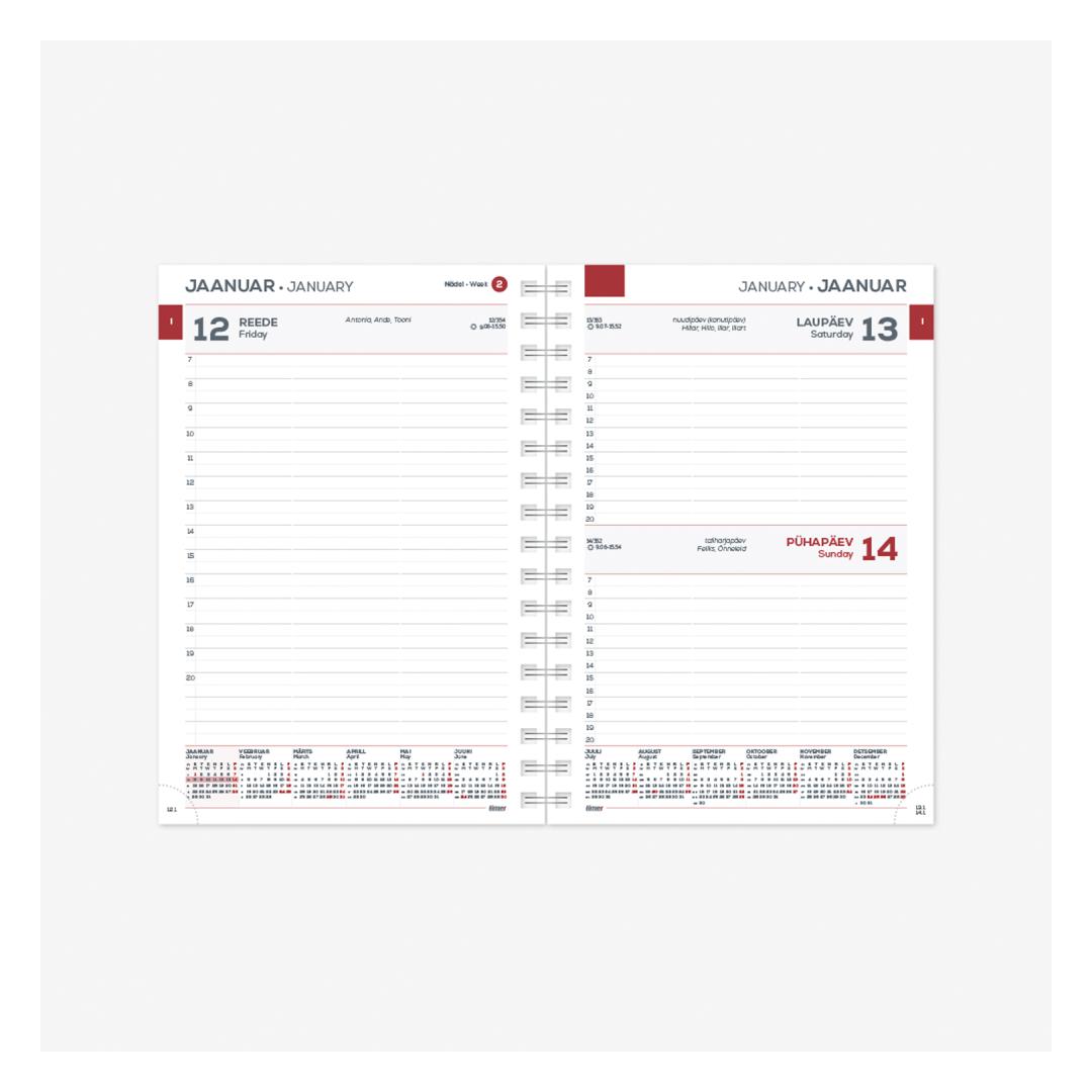 Koko: 145 x 210 mm (A5) Kieli: viro ja englanti Kierresidonta Rei'itetyt kulmat Sopii seuraaviin kansiin: MINISTER PVC Week MINISTER Spirex MINISTER Trend MINISTER Flex MINISTER Exclusive MINISTER Pattern MINISTER Embroidery MINISTER Linen MINISTER Twine MINISTER Majestic MINISTER 18 MONTHS Flex UNIKA Spirex UNIKA Trend UNIKA Flex UNIKA Flex UNIKA Flex