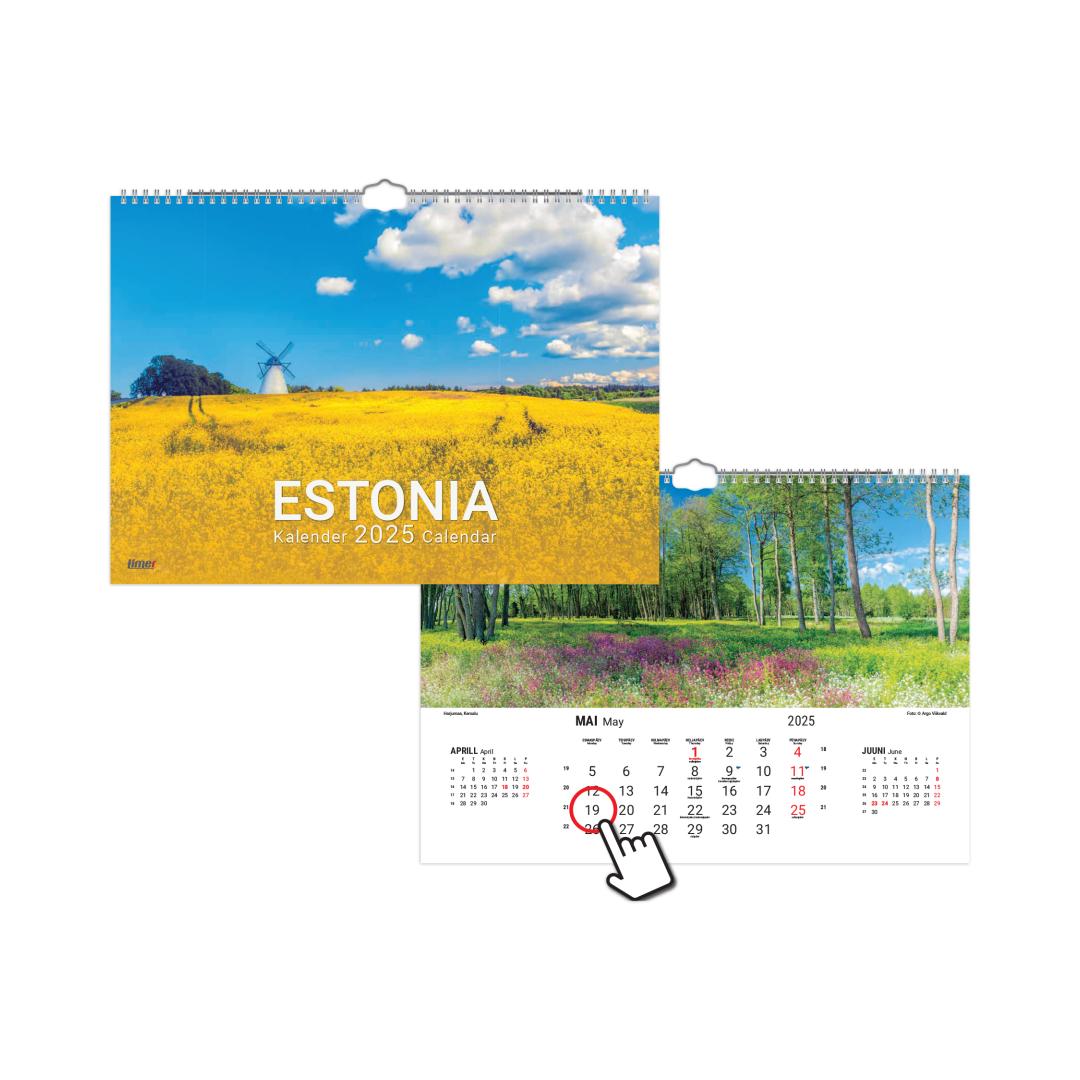 Koko: 300 x 245 mm Kierresidonta Saranoitu aukeama Staattinen päivämäärämerkintä Kieli: englanti ja viro Seikkailukalenteri sisältää: 37 maan kansalliset juhlapäivät lyhenteineen, yleiset vapaapäivät, kansalliset ja kansalliset kalenteripyhät, liputuspäivät, viikon numeron, edellisen ja seuraavan kuukauden.