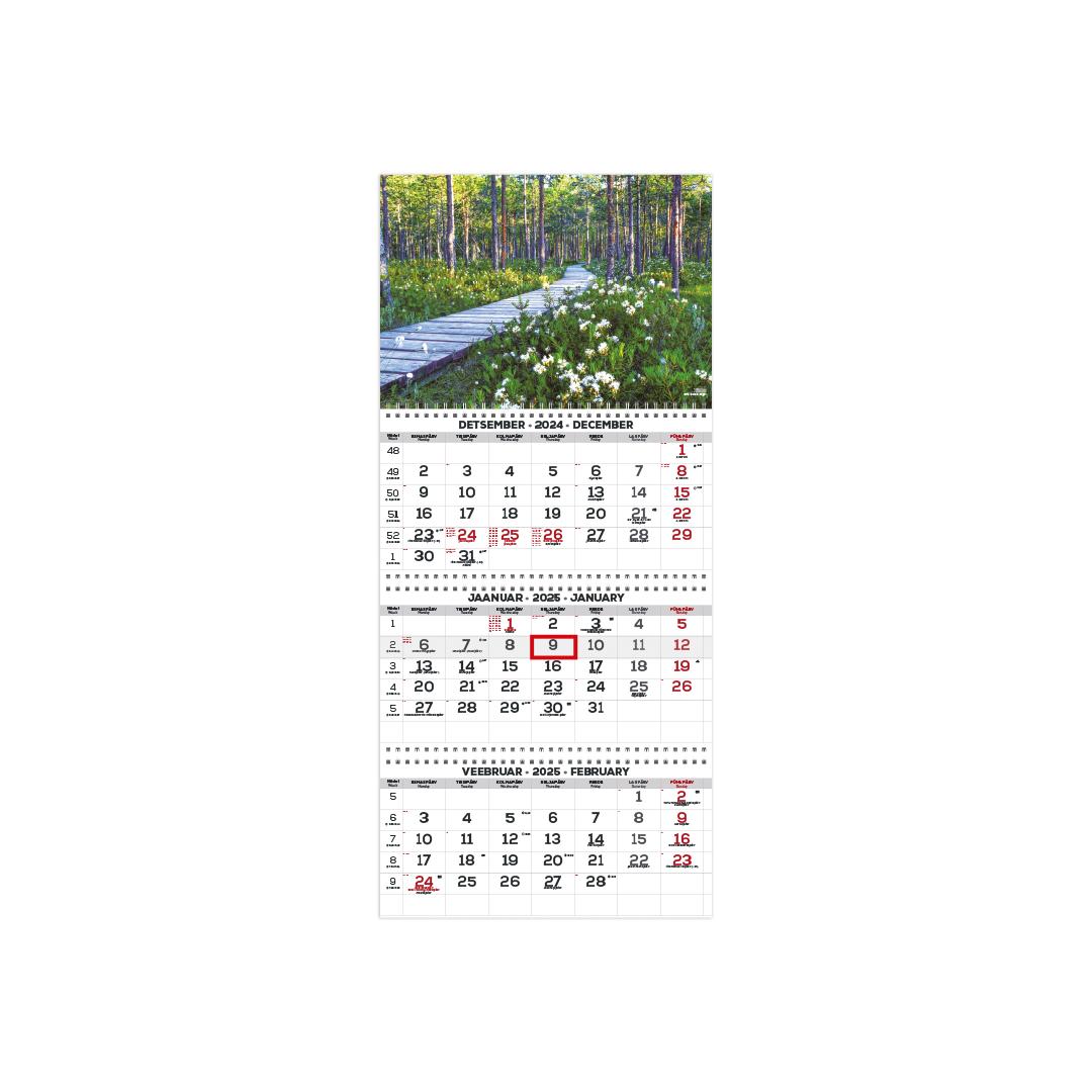 Koko: 297 x 650 mm Kolmiosainen kierresidonta Ripustusreikä Kapasiteetti 3 x 12 sivua Päivämäärämerkintä Sisältö tummanharmaa / punainen Kieli: englanti ja viro Kalenteri sisältää: Juhlapyhät, kansalliset ja kansalliset kalenterimerkinnät, liputuspäivät, 37 maan juhlapyhät lyhenteineen, kesä- ja talviaikaan siirtyminen, auringonnousu- ja -laskuajat (Tallinna), kuukauden vaiheet kellonaikoineen, horoskooppimerkit, vuodenaikojen alkamisajat kellonaikoineen, edeltävä ja seuraava kuukausi, viikkonumero.