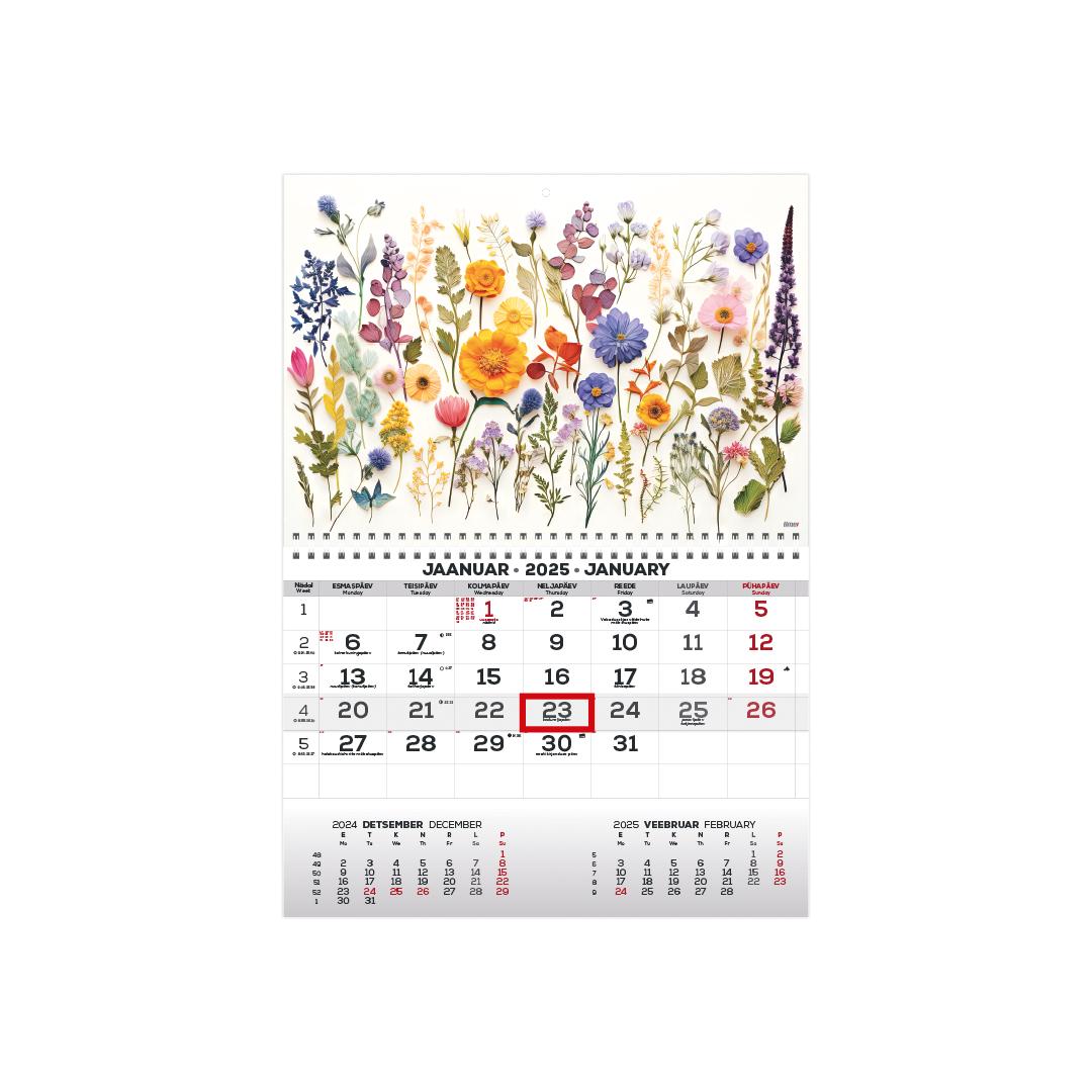 Koko: 297 x 420 mm Kierresidonta Saranoitu kansi Tilavuus 12 sivua Päivämäärämerkintä Sisältö tummanharmaa / punainen Kieli: englanti ja viro Kalenteri sisältää: Kalenteri sisältää: yleiset juhlapäivät, kansalliset ja kansalliset kalenteritarkkailut, liputuspäivät, 37 maan yleiset juhlapäivät lyhenteineen, kesä- ja talviaikaan siirtyminen, auringonnousu- ja -laskuajat (Tallinnassa), kuukauden vaiheet kellonaikoineen, horoskooppimerkit, vuodenaikojen alkamisajat kellonaikoineen, edeltävä ja seuraava kuukausi, viikkonumero. kalenteri.