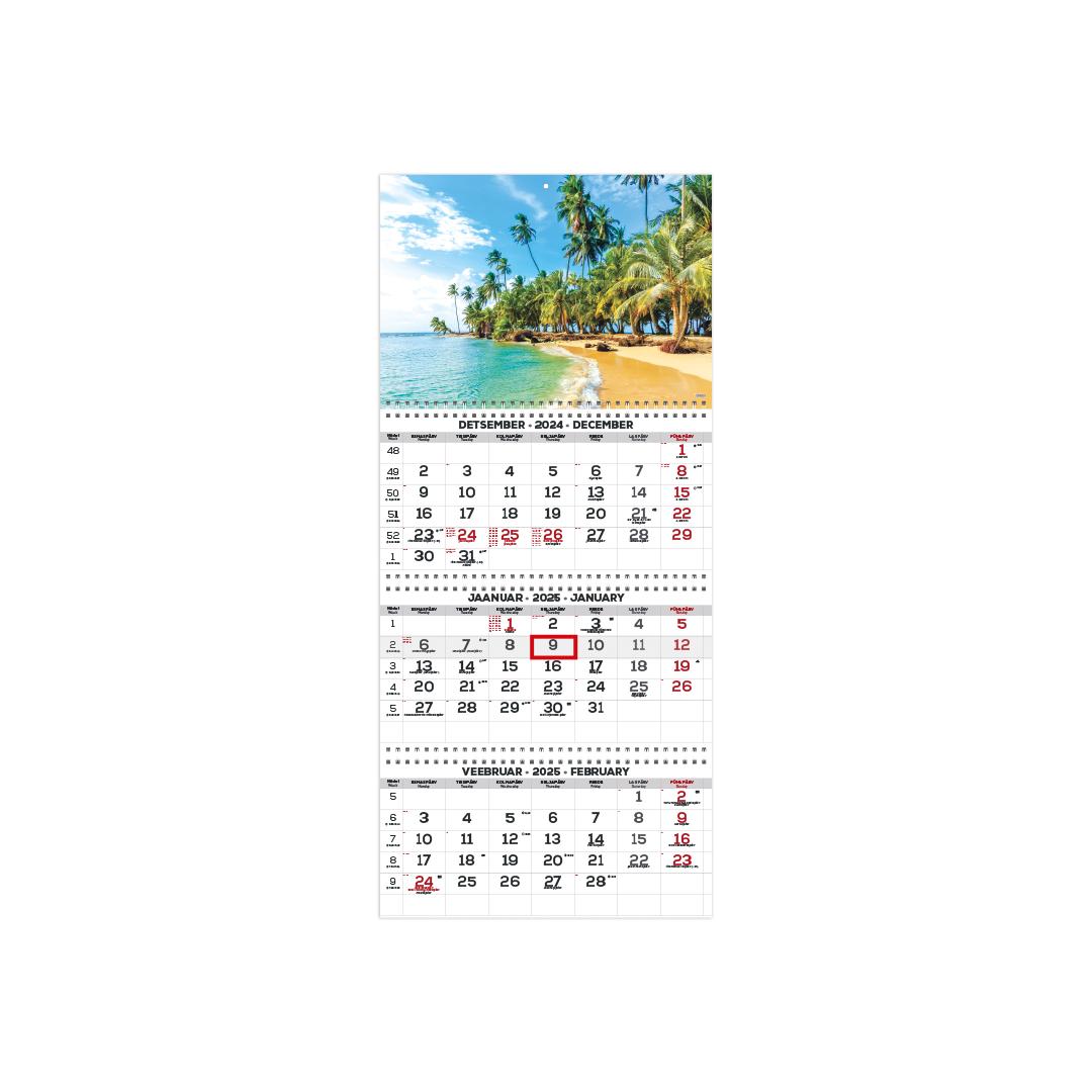 Koko: 297 x 650 mm Kolmiosainen kierresidonta Ripustusreikä Kapasiteetti 3 x 12 sivua Päivämäärämerkintä Sisältö tummanharmaa / punainen Kieli: englanti ja viro Kalenteri sisältää: Juhlapyhät, kansalliset ja kansalliset kalenterimerkinnät, liputuspäivät, 37 maan juhlapyhät lyhenteineen, kesä- ja talviaikaan siirtyminen, auringonnousu- ja -laskuajat (Tallinna), kuukauden vaiheet kellonaikoineen, horoskooppimerkit, vuodenaikojen alkamisajat kellonaikoineen, edeltävä ja seuraava kuukausi, viikkonumero.
